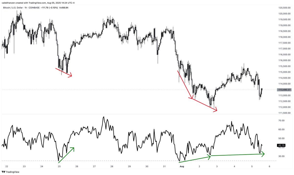 З іншого боку, аналітик Калеб Франзен вказав, що біткоїн пробився через мінімуми, визначені бичачою дивергенцією RSI. Коли ціна робить нижчі мінімуми, але RSI не слідує за нею (бичача дивергенція), це сигналізує про ослаблення низхідного імпульсу. Навпаки, ведмежа дивергенція виникає, коли ціна зростає, але RSI падає, попереджаючи про можливий низхідний розворот.