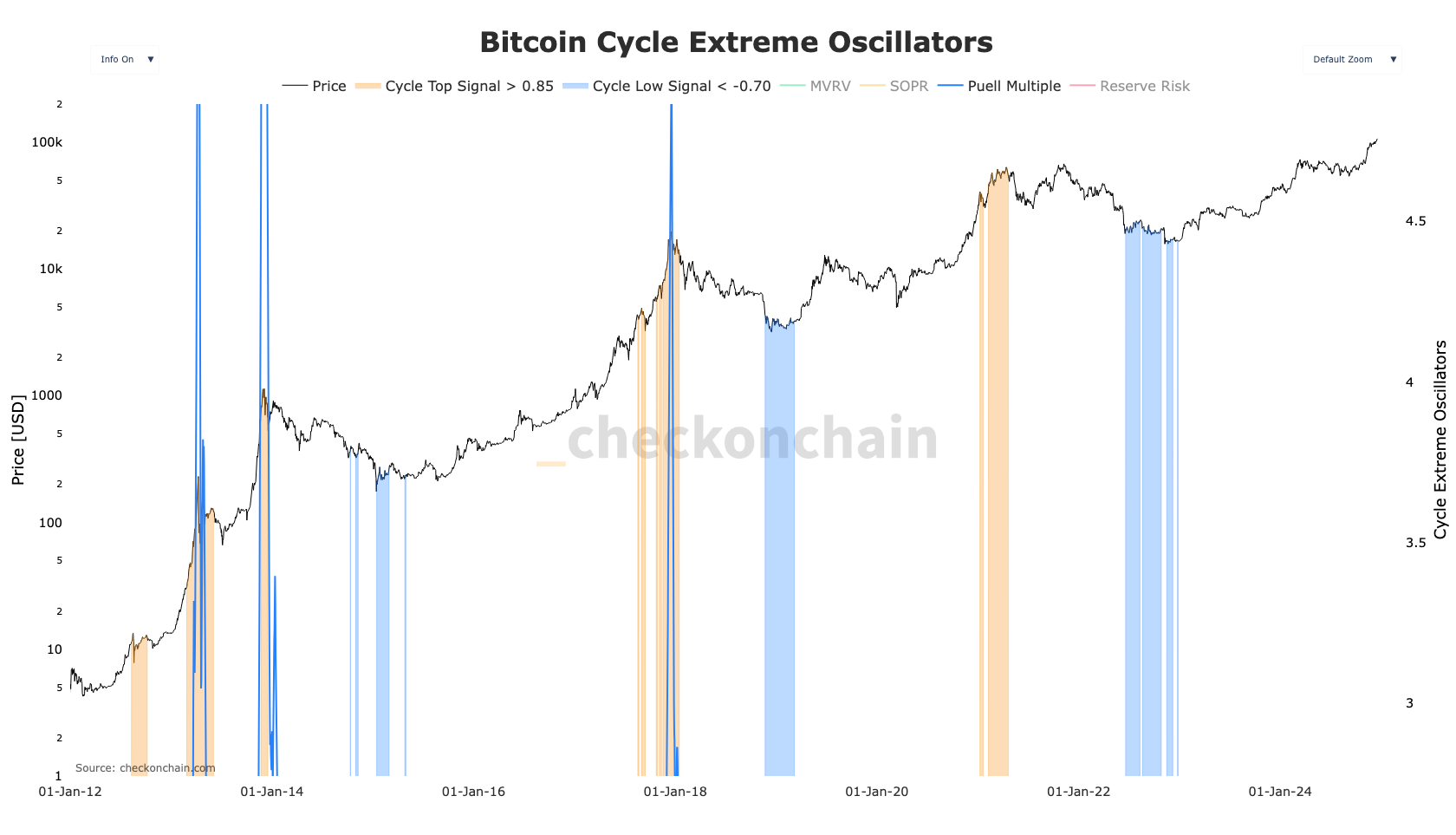 З точки зору ончейн-аналізу, кілька екстремальних осциляторів циклу Bitcoin підтримують можливість вищої вартості. Наприклад, BeInCrypto спостерігає, що BTC досягає вершини, коли Cycle Top перевищує 0,85.