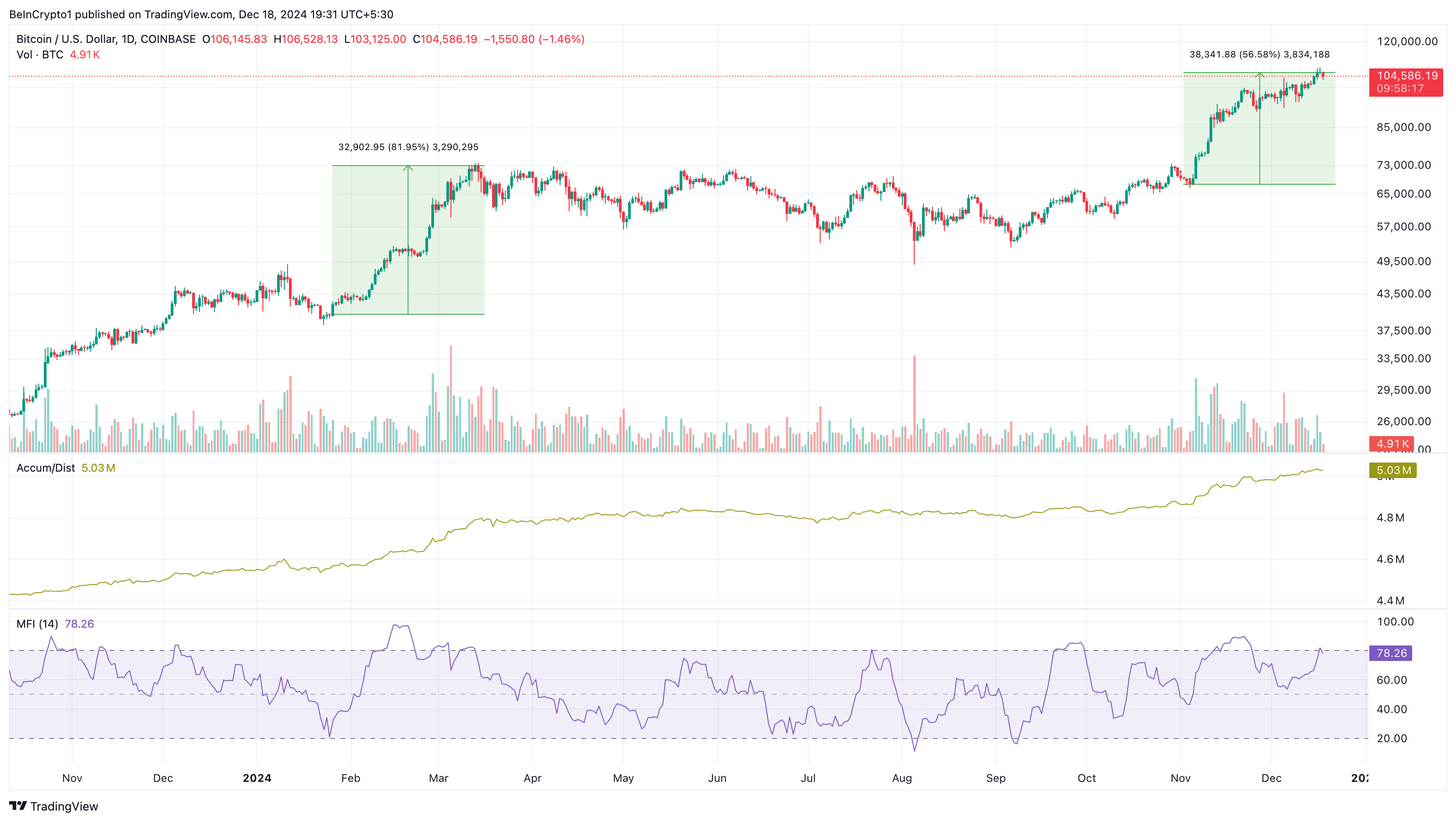 На денному графіку ціна Bitcoin, здається, йде тим самим шляхом, що дозволив їй перевищити $73 750 у березні. У той період BTC піднявся на 81,95% менш ніж за три місяці. Між 5 листопада і моментом написання криптовалюта зросла на 56,58%.