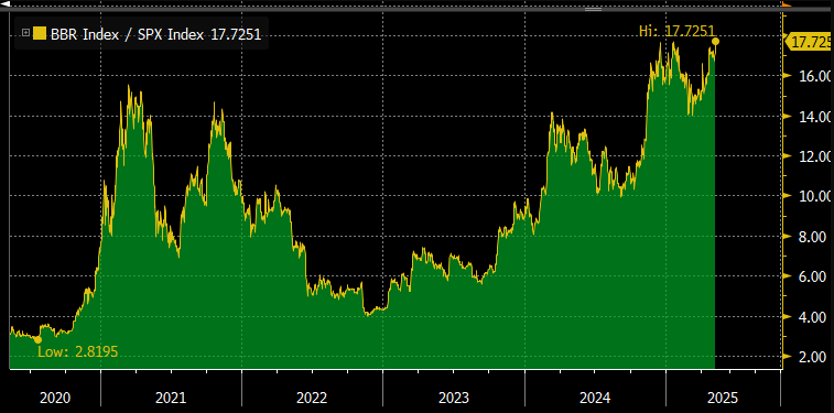 На історичному максимумі індекс BRR/SPX означає, що вартість біткоїна зросла значно більше, ніж S&P 500. Це свідчить про сильнішу впевненість інвесторів та перевищення криптовалюти над акціями.