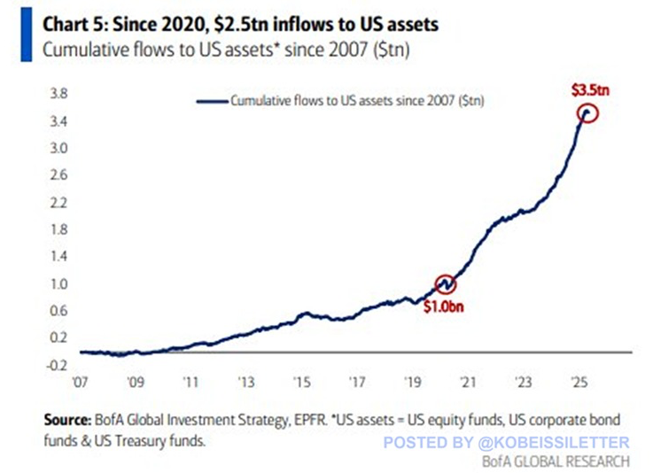 Звіти вказують на 3,5 трлн доларів сукупних припливів до фондів акцій США, корпоративних облігацій та казначейських фондів з 2007 року. Важливо зазначити, що 2,5 трлн доларів цього зростання відбулося після 2020 року.