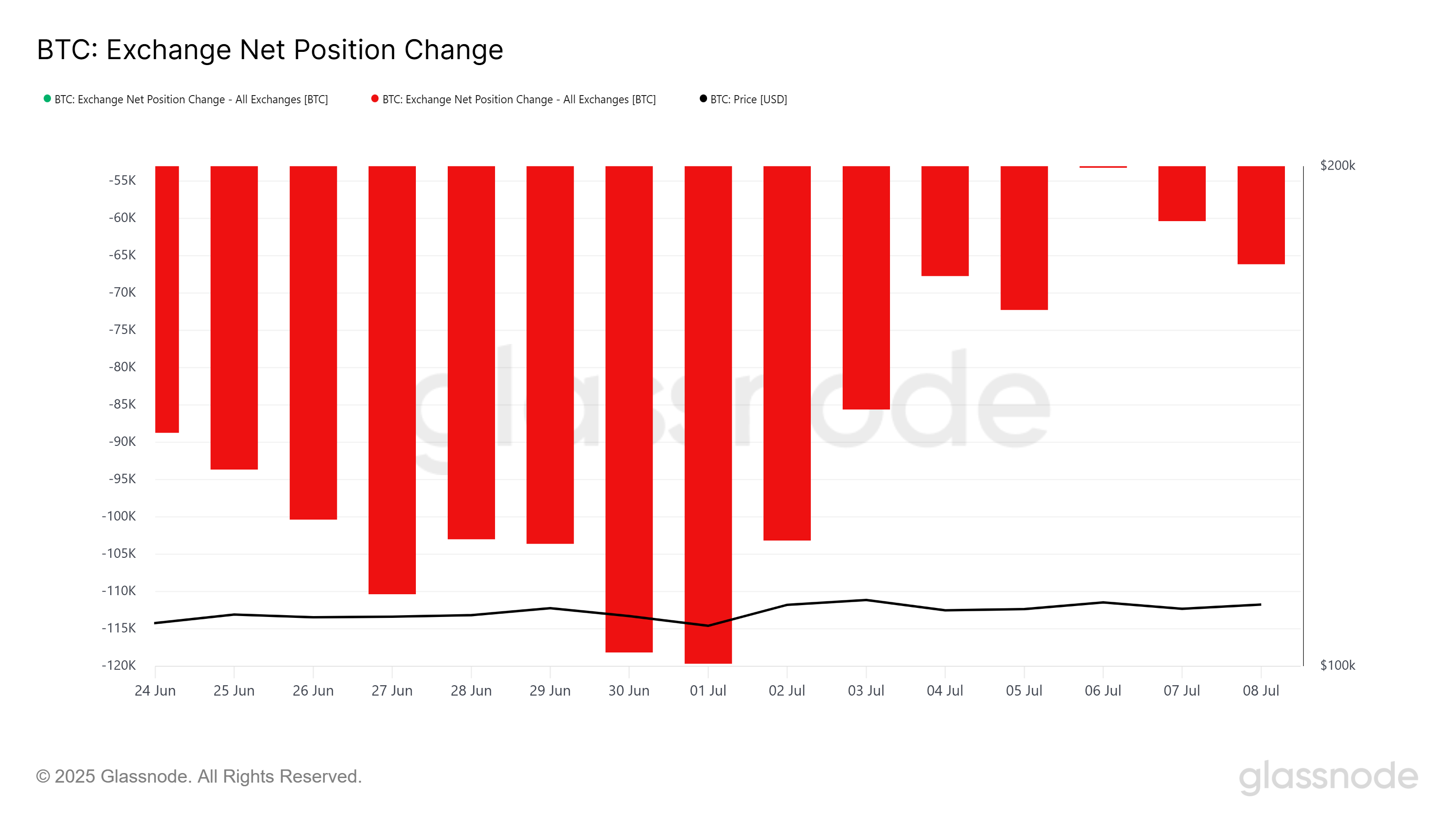 SponsoredЦе також видно у зміні чистої позиції бірж, яка, як правило, впливає на макроімпульс біткоїна. З початку липня понад 52 048 BTC, вартістю приблизно 5,7 млрд доларів, було продано на біржі.