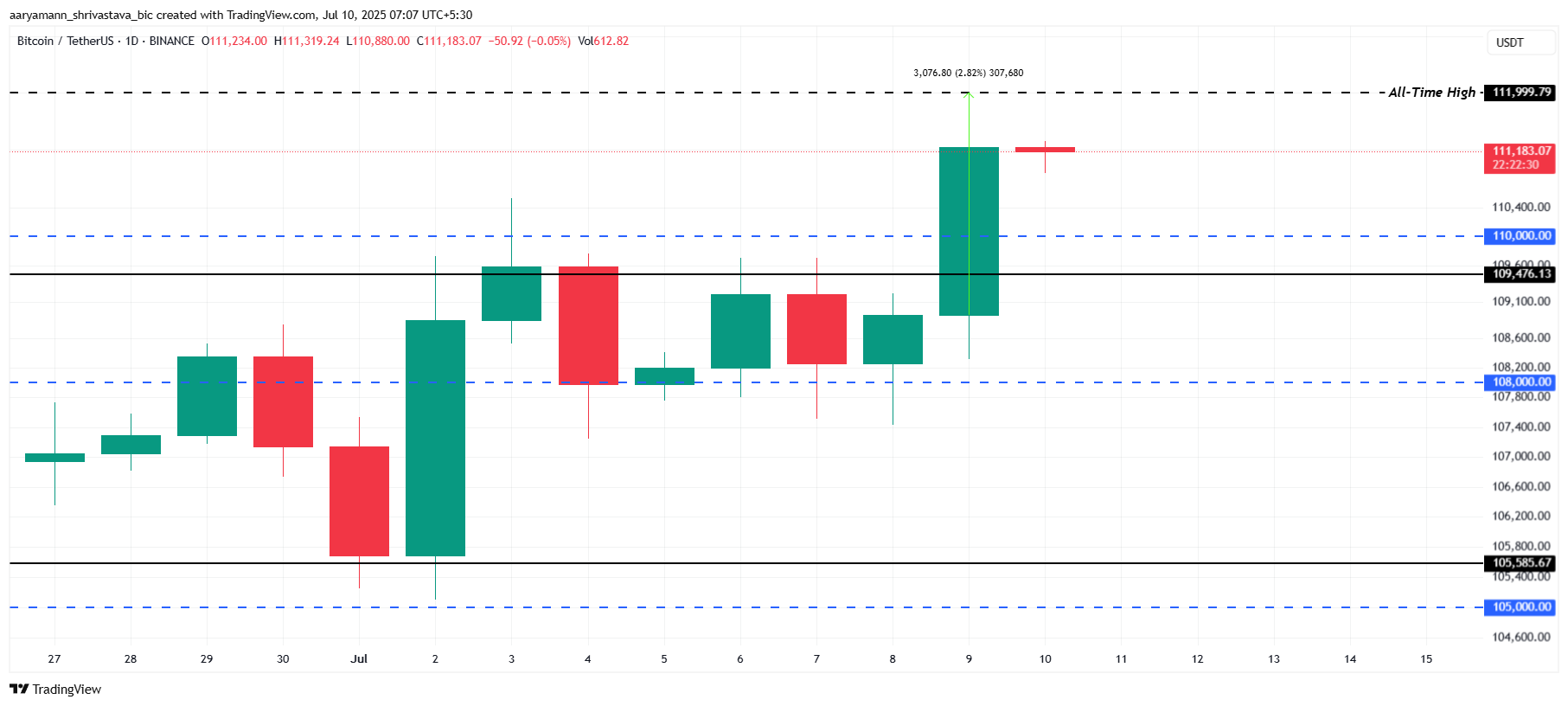 На момент написання, біткоїн торгується на рівні 111 183 доларів, намагаючись закріпити 110 000 доларів як критичну підлогу підтримки. Якщо BTC зможе утримати цей рівень і зберегти висхідний імпульс, він може знову спробувати пробити 112 000 доларів і встановити новий ATH. Це може стати каталізатором для подальшого зростання цін, з очікуваним сильним попитом, що підштовхне ринок вперед.