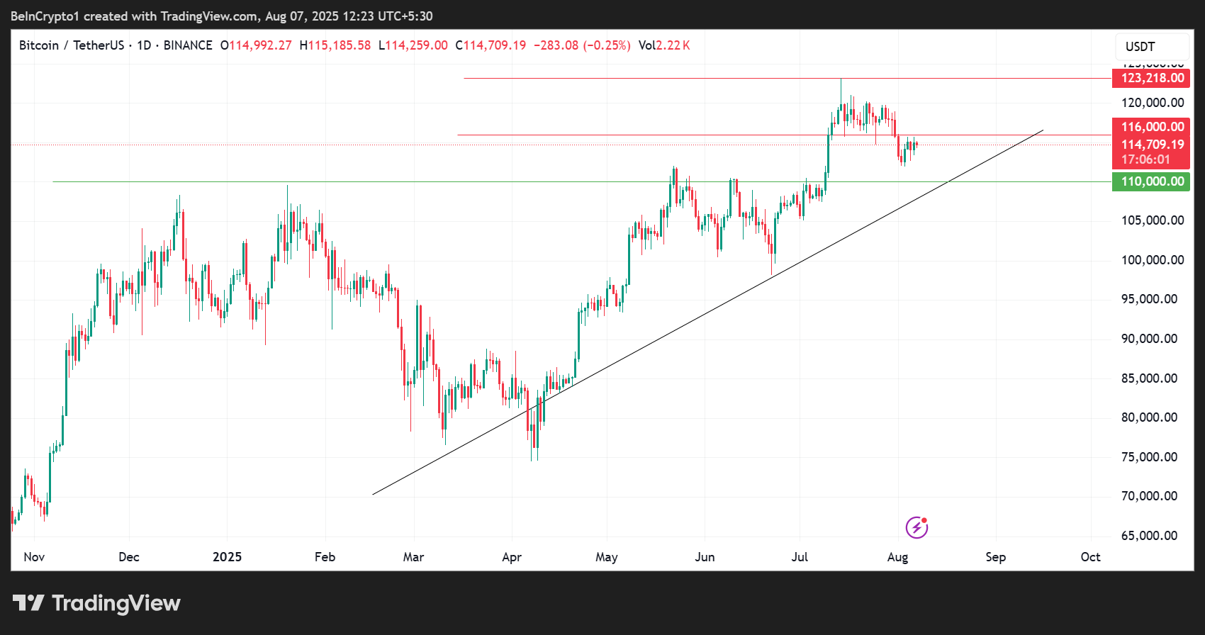 31 липня біткоїн пробив критичний кластер підтримки між 116 000 і 123 000 доларів, увійшовши в зону тонкої ліквідності, що простягається до 110 000 доларів.