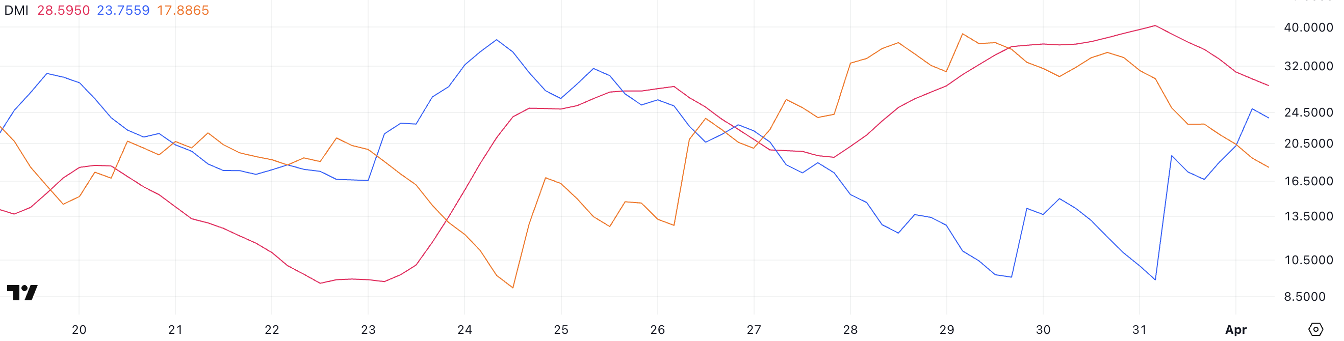 Зазвичай, значення ADX вище 25 сигналізує про сильний тренд, тоді як значення нижче цього рівня вказують на ослаблення або бічний ринок. Хоча 28,59 все ще показує помірну силу тренду, зниження сигналізує про зникаючий імпульс.