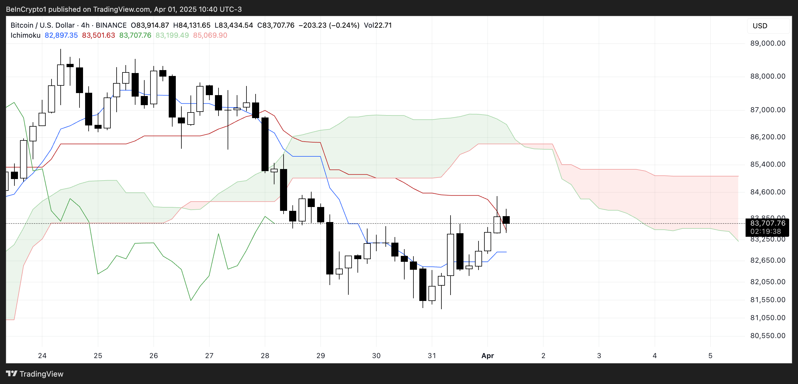 Біткоїн (BTC) входить у квітень на нестійкій основі. Він опинився між зникаючим ведмежим імпульсом і зростаючою невизначеністю напередодні довгоочікуваного оголошення тарифів у середу, відомого як “День визволення”. Технічні індикатори, такі як DMI, хмара Ічімоку та лінії EMA, показують змішані сигнали, з’являються ранні ознаки сили покупців.