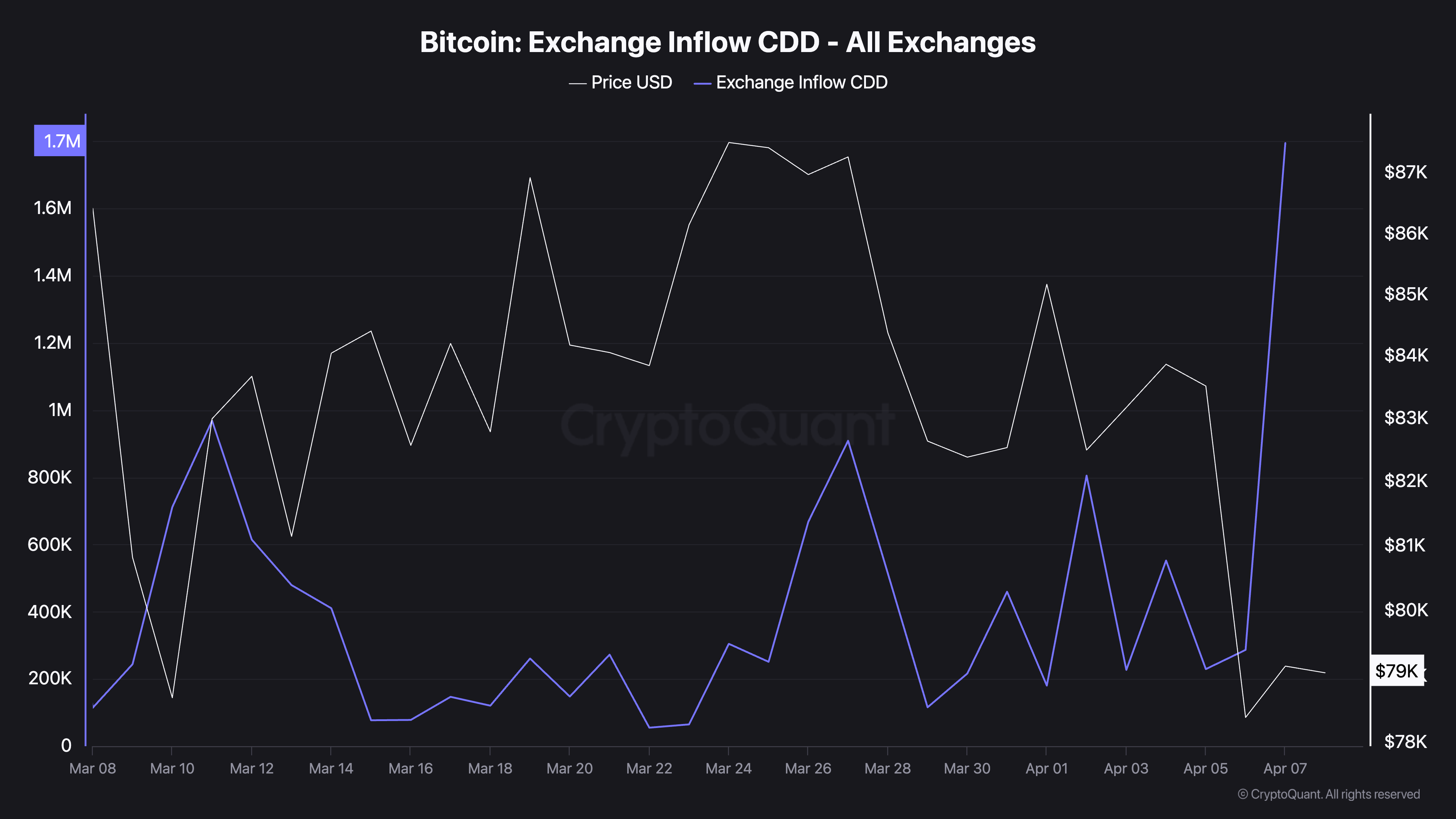 Індикатор Exchange Inflow CDD біткоїна відстежує рух старих токенів на біржі. Він розраховується шляхом множення кількості переміщених біткоїнів на кількість днів, протягом яких ці токени утримувалися без витрат.