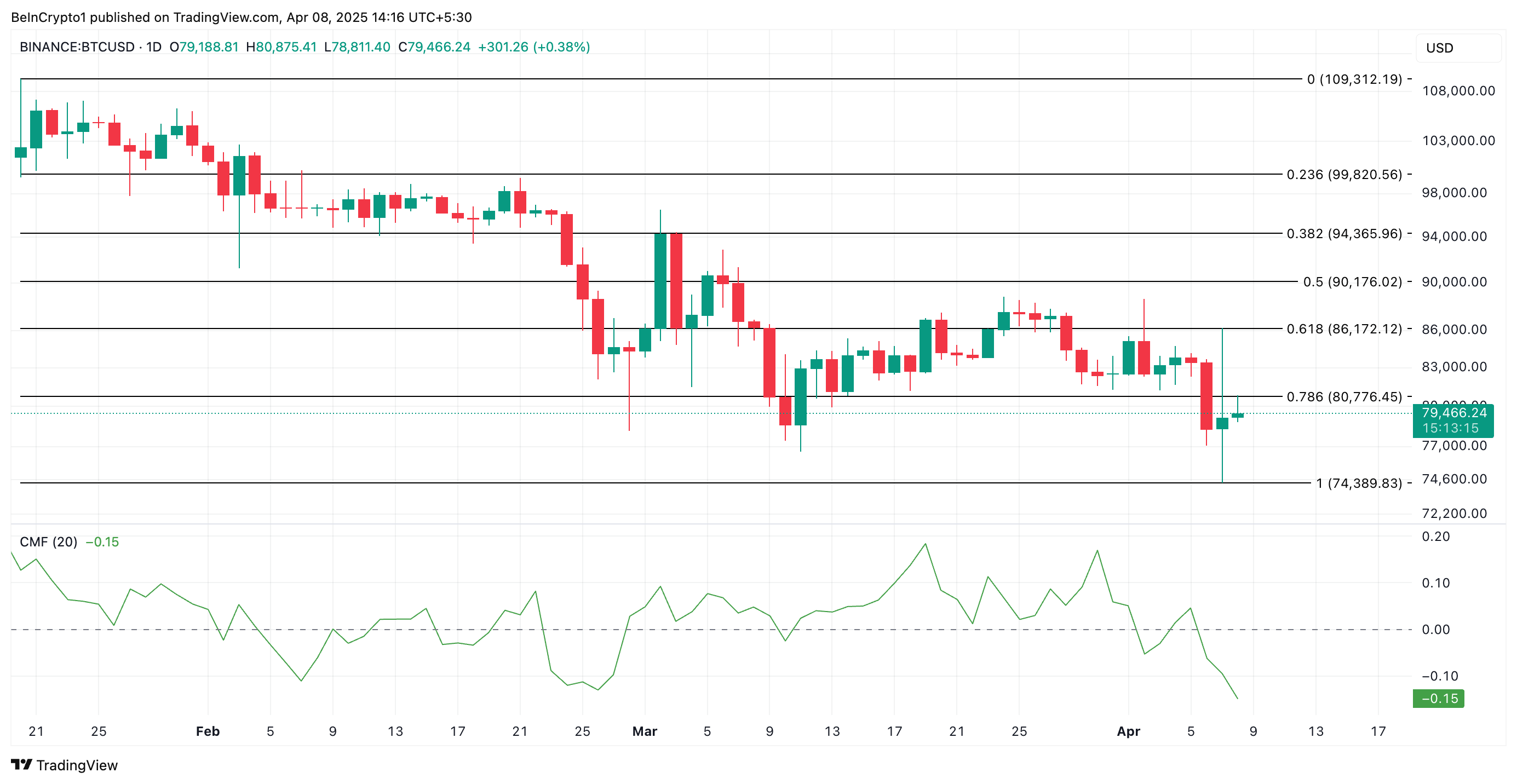 Ведмежа дивергенція виникає, коли ціна активу зростає, а його CMF знижується. Це сигналізує про те, що тиск купівлі слабшає під поверхнею, незважаючи на зростання ціни. Якщо це продовжиться, біткоїн може втратити недавні здобутки і торгуватися на рівні 74 389 доларів.