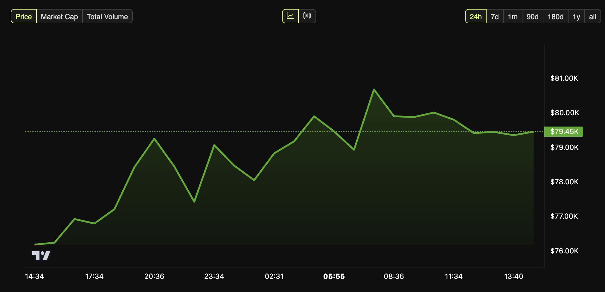 Попри довгостроковий оптимізм, макроекономічні умови сильно вплинули на біткоїн, змушуючи його впасти нижче 80 000 доларів. Проте дані BeInCrypto показали, що біткоїн зазнав помірного зростання на 5,0% за останню добу. На момент написання він торгувався за 79 454 доларів.