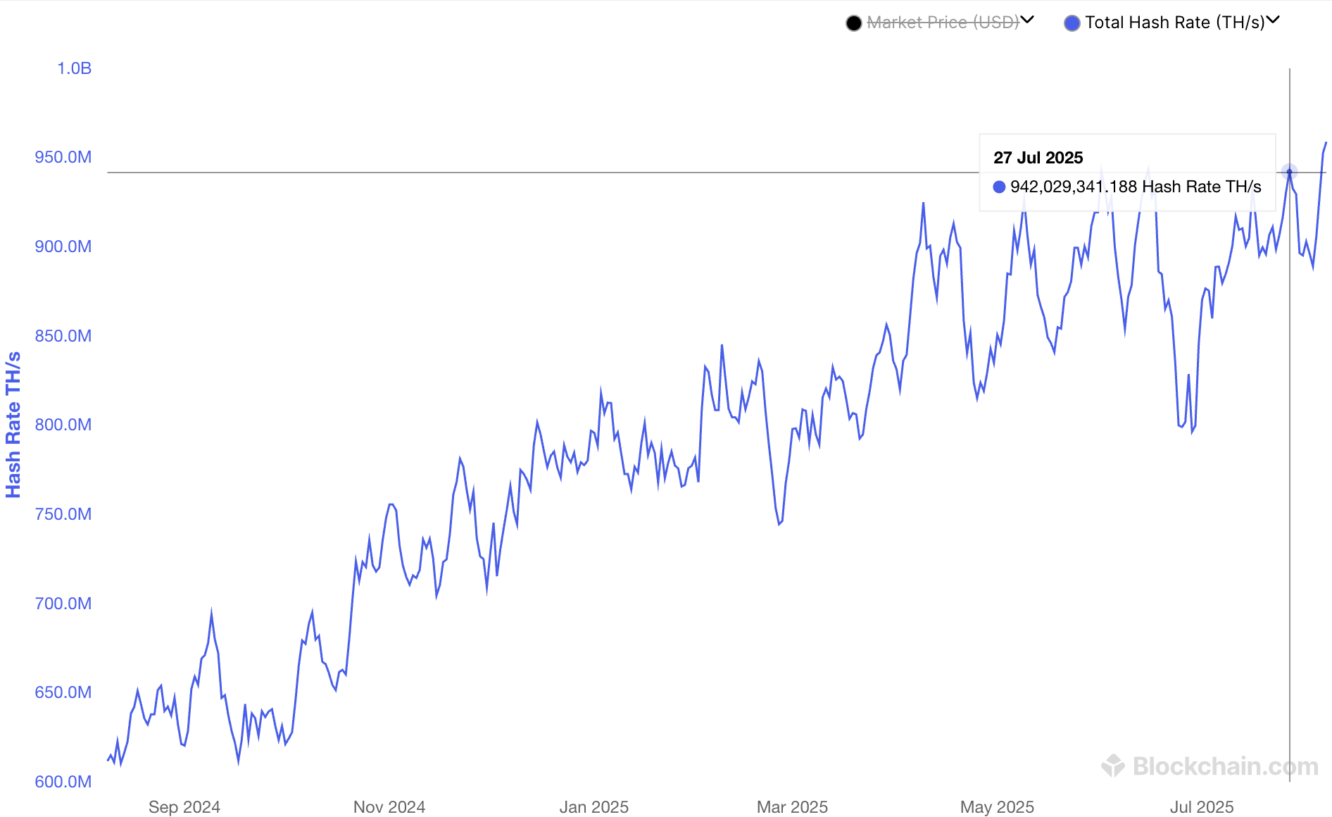 Дані з Blockchain.com свідчать, що загальний хешрейт мережі значно відновився у липні, наближаючись до свого історичного максимуму. Це демонструє, що компанії з майнінгу повертаються до режиму розширення після подолання різних викликів у попередньому місяці.