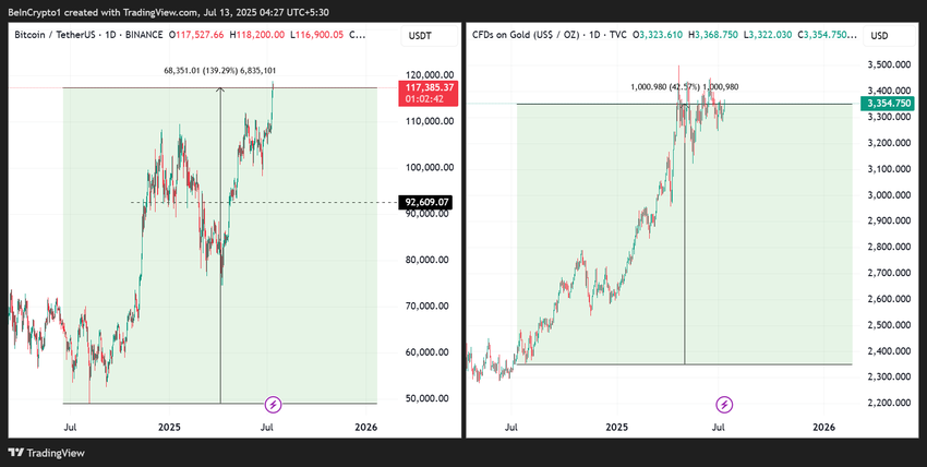 Біткоїн зріс майже на 140% від початку року, тоді як золото зросло лише трохи більше ніж на 40%.