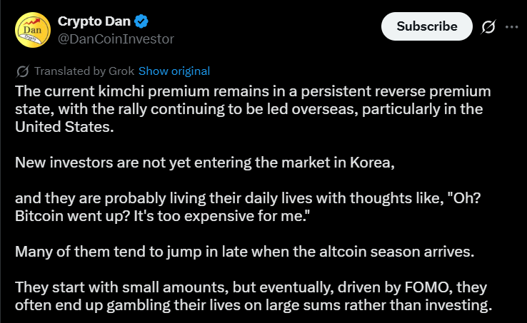 У попередніх бичачих ралі (2017, 2021) Корея часто спостерігала премії понад +10 % або більше, зумовлені спекулятивним роздрібним ажіотажем. Ця динаміка сьогодні відсутня.