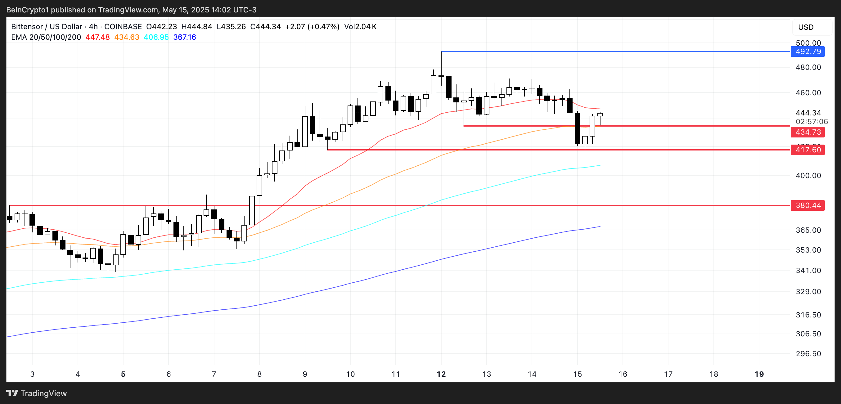 Нещодавно TAO протестував ключовий рівень підтримки на позначці 417,6 доларів і відскочив вище 440 доларів, демонструючи стійкість після короткочасного зниження. Лінії експоненційних ковзних середніх (EMA) усе ще відображають бичачу структуру, із короткостроковими середніми, розташованими вище довгострокових.