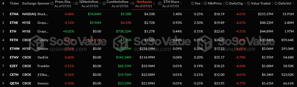 1 липня ETHA зафіксував 54,8 млн доларів припливів, що ефективно сприяло 5,5 млрд доларів з моменту заснування. Він також підтримував припливи протягом 29 з останніх 30 днів, ефективно проходячи як найуспішніші Ethereum фонди, що наразі є на ринку.