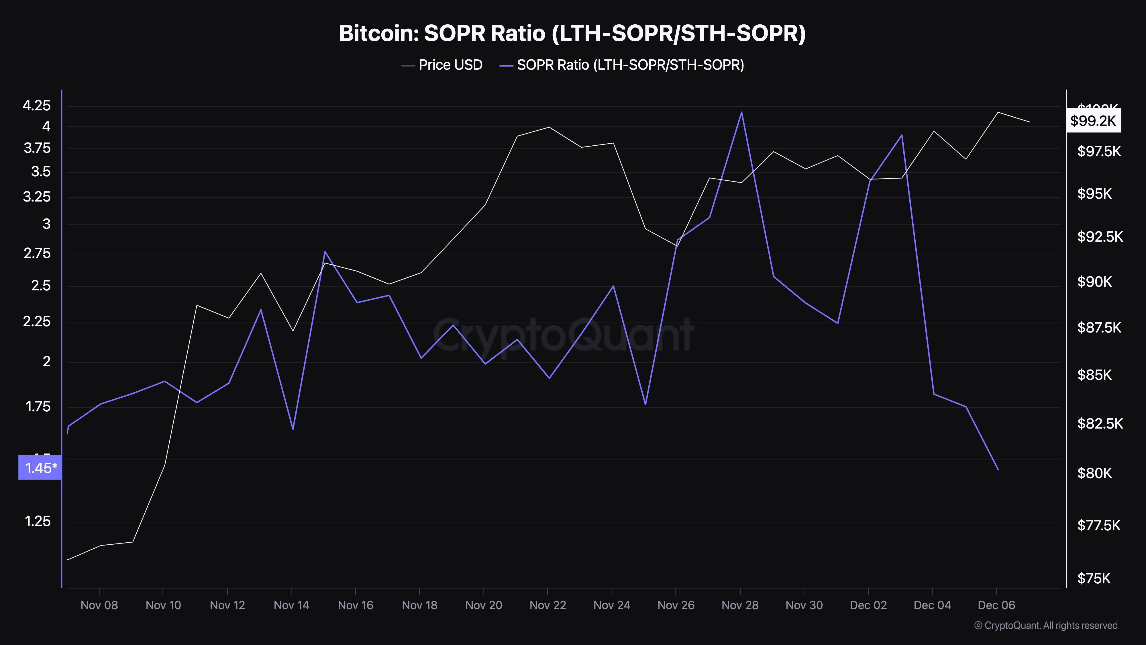 Коли коефіцієнт високий, це означає, що LTH мають більші витрачені прибутки ніж STH. У такому випадку ціна близька до локального або ринкового максимуму. Однак, за даними CryptoQuant, Bitcoin SOPR знизився до 1,45, що вказує на перевагу STH, і ціна ближче до дна, ніж до вершини.