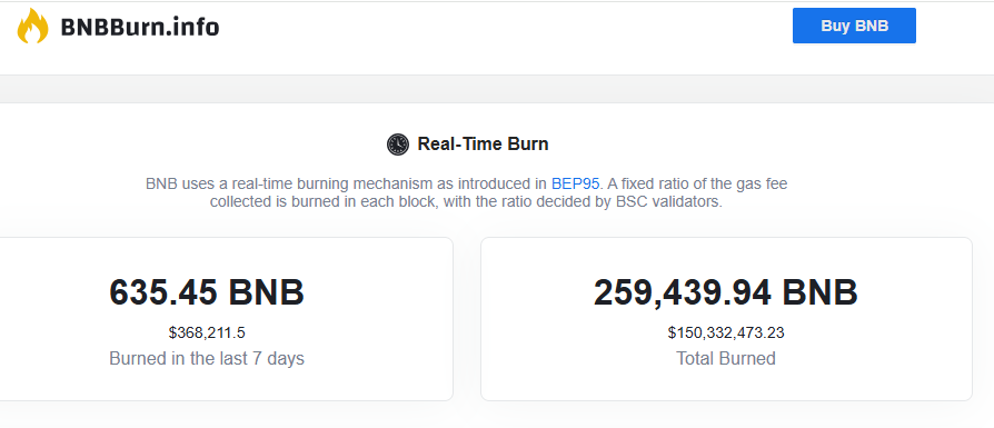 Окрім квартального Auto-Burn, BNB реалізує модель спалення в реальному часі, яка назавжди вилучає частину комісій за газ з обігу. З моменту свого заснування через цей механізм було спалено понад 259 000 токенів BNB.