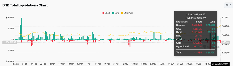 Тим часом, з підвищенням ціни BNB до нового ATH, короткі позиції вартістю 1,58 млн доларів були ліквідовані, проти скромних 21 720 доларів у довгих позиціях.
