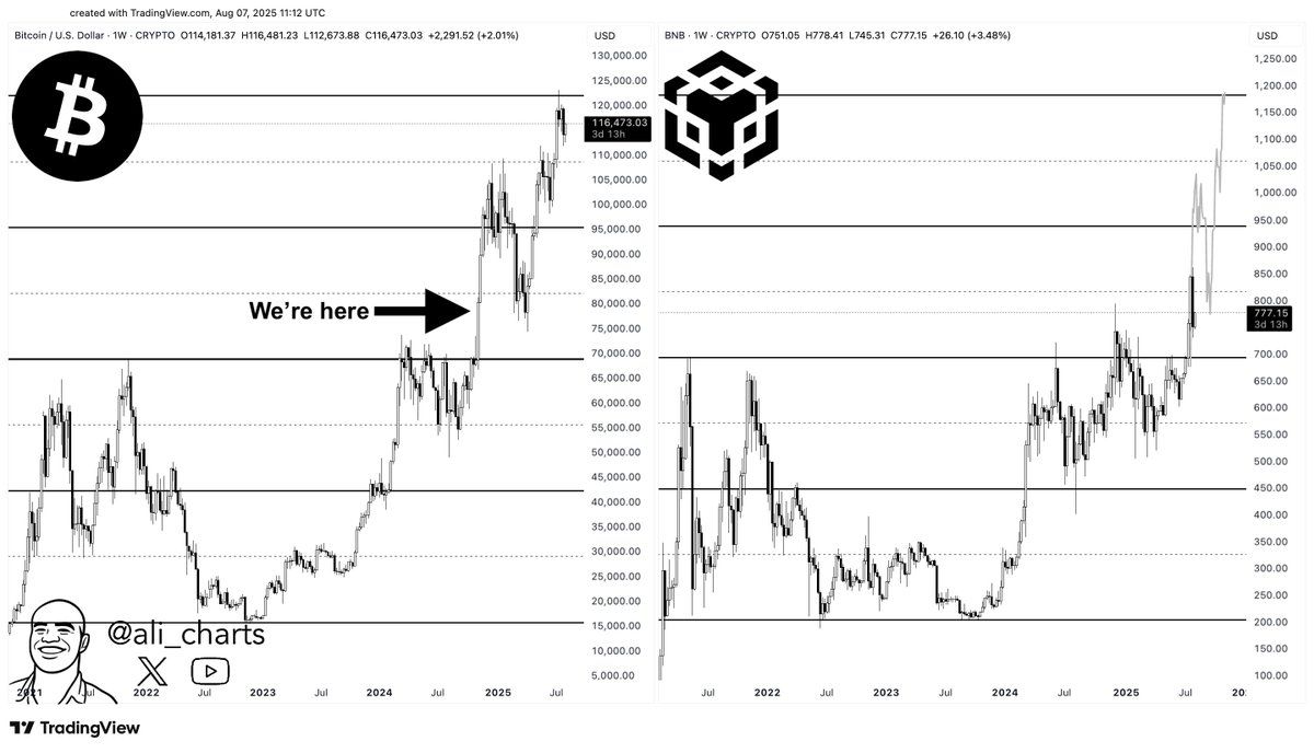 Крім того, криптоаналітик Алі поділився на X, що цінова структура Binance Coin відображає цінову динаміку біткоїна. На основі цього спостереження Алі вважає, що BNB може увійти в ранню фазу ралі до позначки 1 200 доларів.