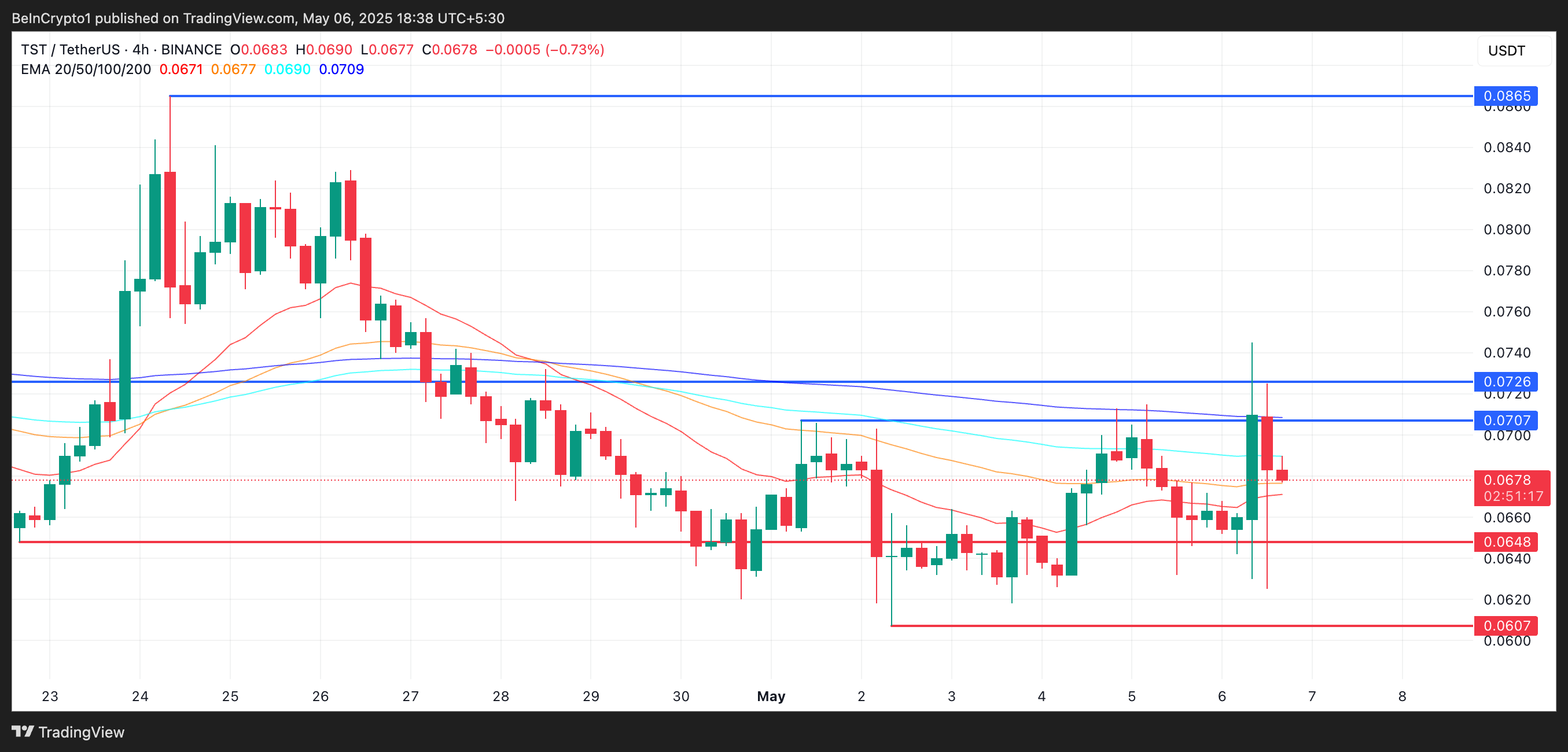 Однак підтримка на рівні 0,0648 доларів залишається критично важливою — якщо вона зламається, TST ризикує впасти до 0,060 доларів.