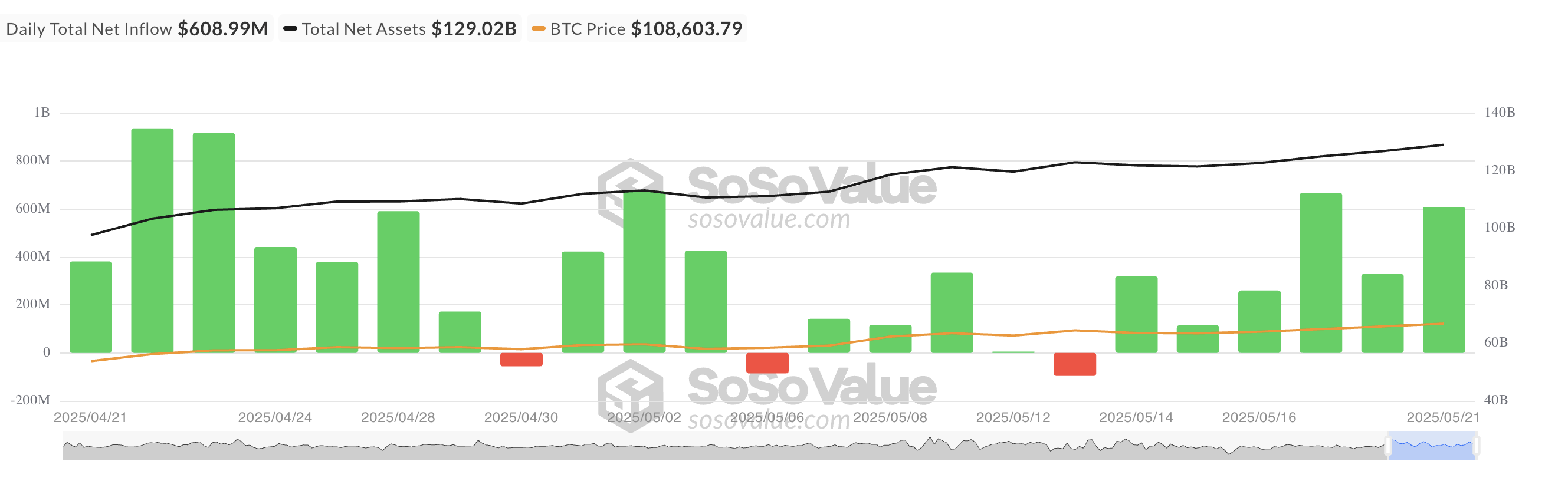 Прорив біткоїна вище психологічної позначки в 110 000 доларів вчора викликав значні притоки у спотові ETF-и. За даними SosoValue, інвестори вклали 608,99 млн доларів нового капіталу в ці фонди, що підняло загальну чисту вартість активів усіх спотових ETF-ів біткоїна до 129,02 млрд доларів.