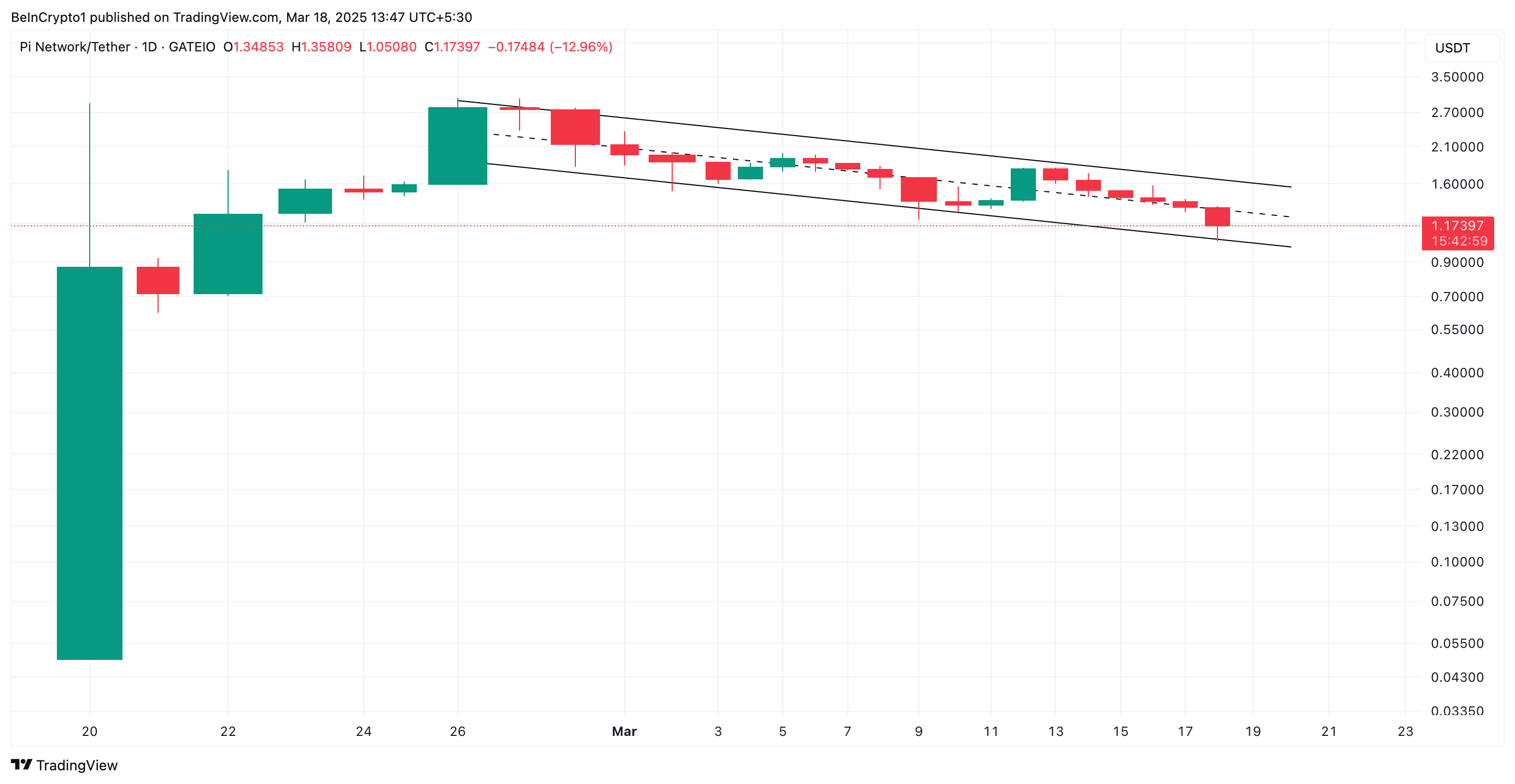 З початку березня PI перебуває у спаді. Токен торгується в межах низхідного паралельного каналу, що зазвичай вказує на стійкий низхідний рух.