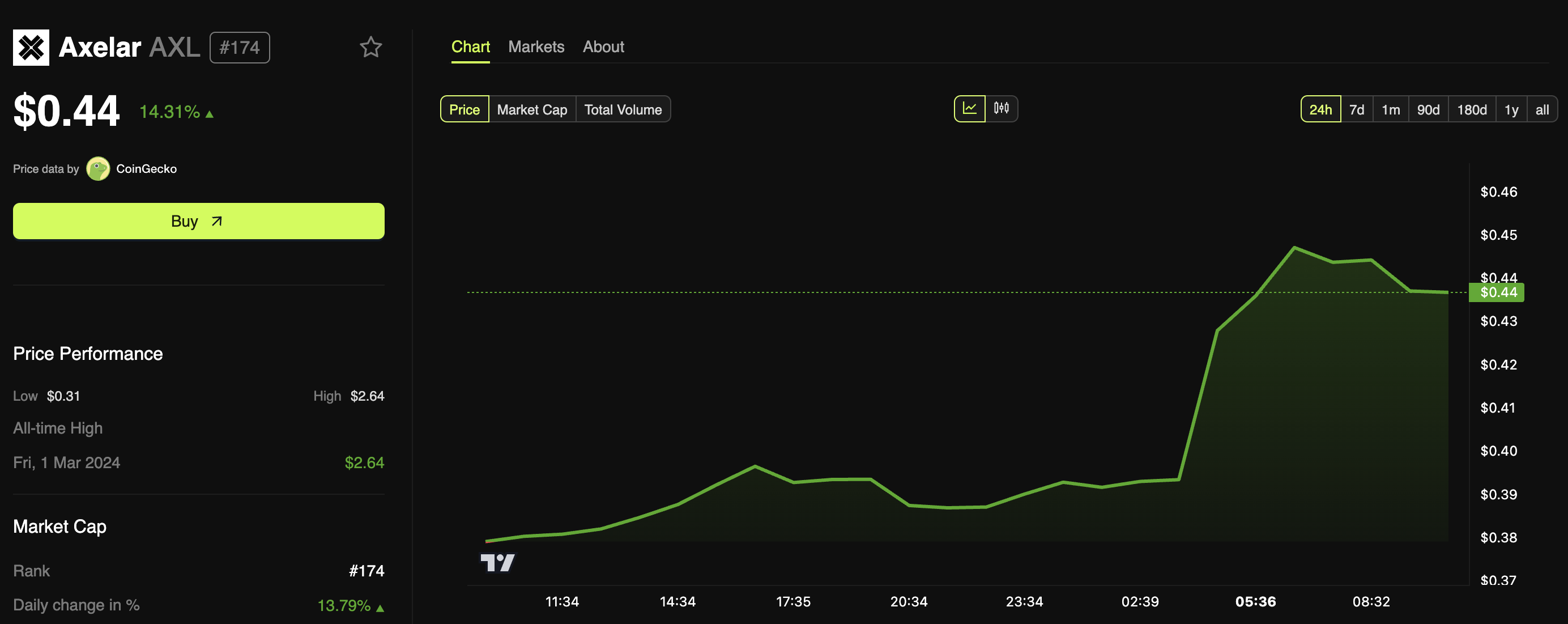 Обсяг торгів також зріс до 35 700 000 доларів. Це позначило зростання на 131,8% порівняно з попереднім днем. З ринковою капіталізацією у 405 500 000 доларів Axelar наразі посідає 174 місце у рейтингу CoinGecko.