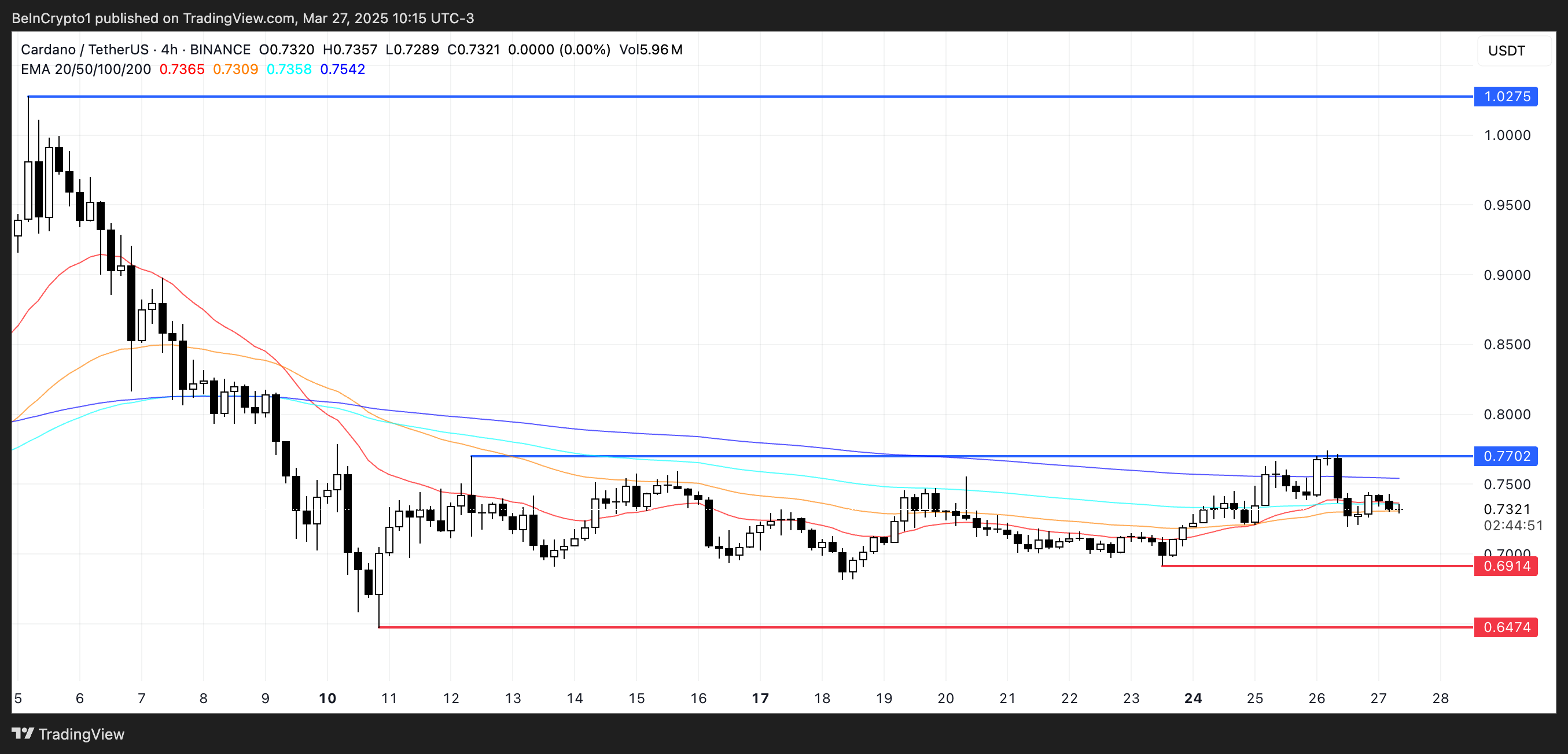 Лінії DMI Cardano свідчать про те, що актив зазнає корекції після невдалої спроби прорватися вище ключового рівня опору на рівні 0,77 долара.