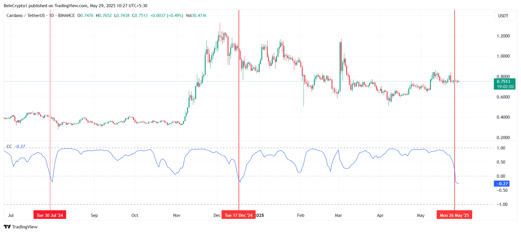 Кореляція між Cardano та біткоїном знизилася до -0,27, що свідчить про те, що ADA наразі рухається незалежно від цінових трендів біткоїна. Це роз’єднання викликає занепокоєння, оскільки біткоїн нещодавно досяг нового історичного максимуму (ATH), а невдача ADA слідувати за ним може сигналізувати про слабкість імпульсу альткоїна.