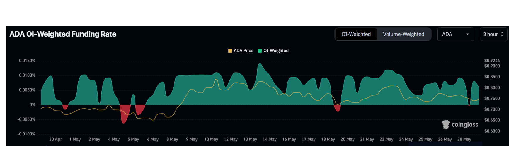 Незважаючи на змішані сигнали ринку, трейдери Cardano залишаються налаштованими на зростання, що відображається у ставці фінансування. Переважно позитивні ставки фінансування протягом місяця свідчать про домінування довгих контрактів над короткими. Це вказує на те, що трейдери очікують зростання ціни ADA і зберігають сильний бичачий настрій.