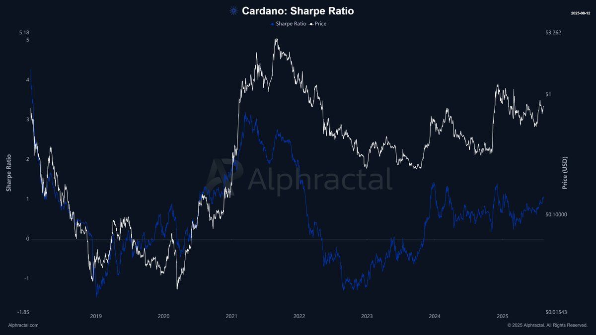 Нещодавно кити також придбали понад 200 мільйонів ADA, що свідчить про високу впевненість з боку великих власників капіталу. Індикатори ризик-скоригованої дохідності також демонструють зростання, відображаючи підвищений потенціал прибутку на тлі контрольованої волатильності.