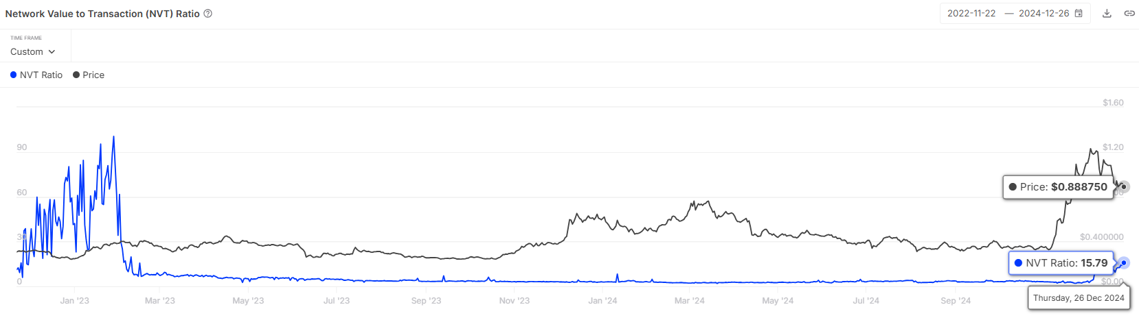 Макро моментум Cardano, однак, представляє виклики. Співвідношення Network Value to Transactions (NVT) знаходиться на 22-місячному максимумі, сигналізуючи про ведмежий тренд. Високе співвідношення NVT вказує на те, що оцінка мережі значно випереджає її транзакційну активність, що відображає слабкий попит на ланцюгу та зниження інтересу інвесторів.