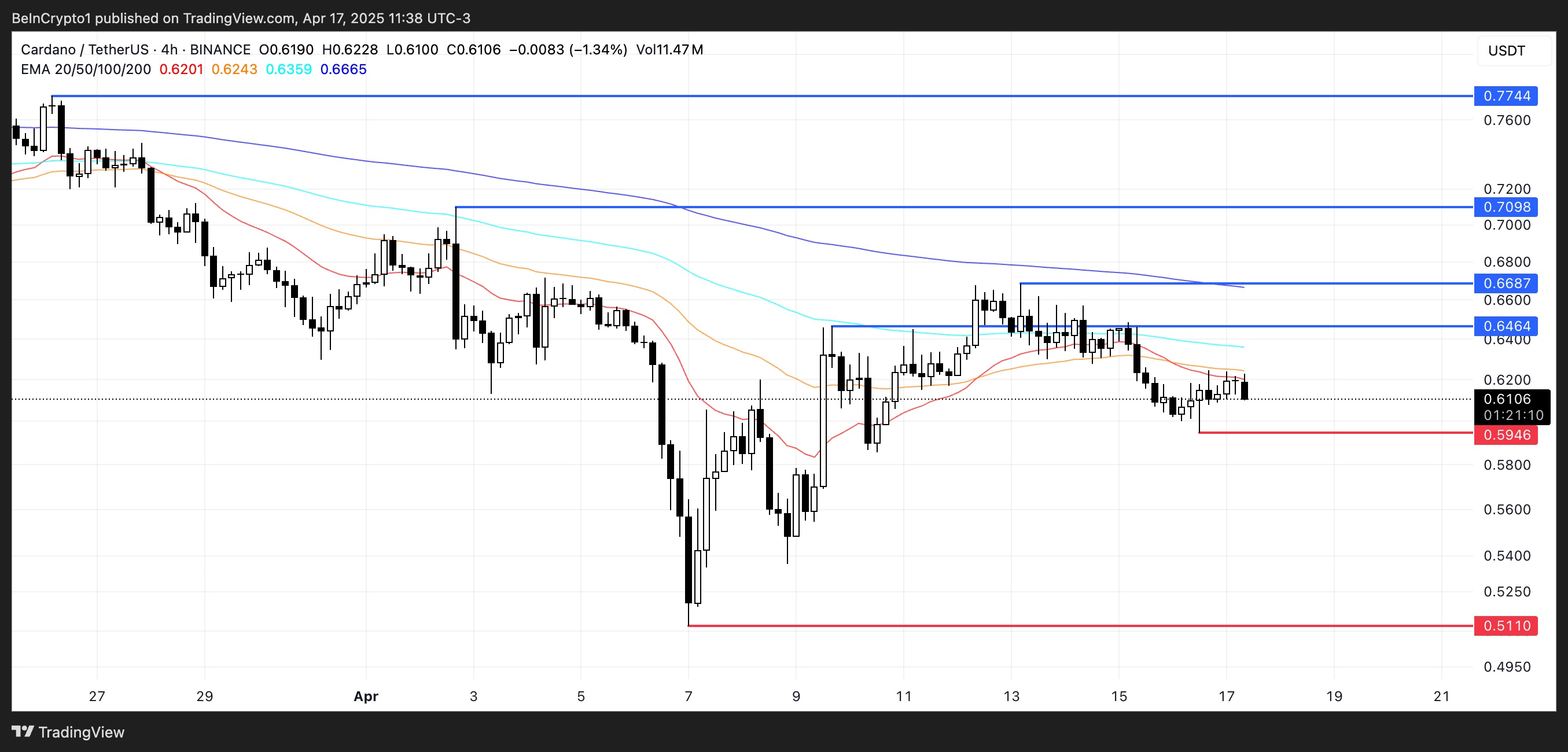 Лінії EMA Cardano залишаються ведмежими, з короткостроковими середніми, що все ще розташовані нижче довгострокових, що вказує на збереження низхідного моментуму.