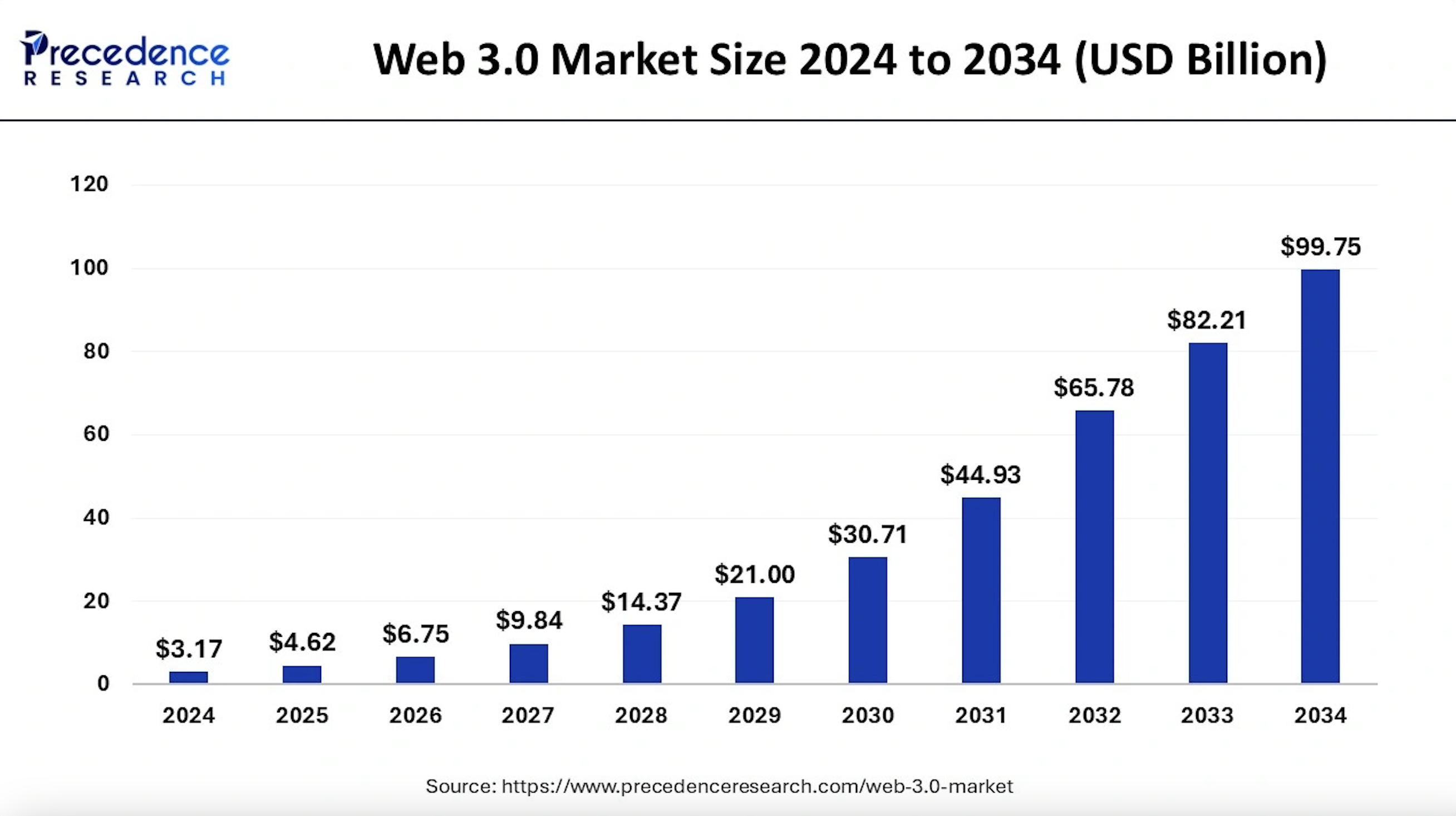Дослідження Precedence Research оцінює, що ринок Web 3.0 розшириться з 4,62 мільярдів доларів у 2025 році до приблизно 99,75 мільярдів доларів до 2034 року, з прогнозованим середньорічним темпом зростання (CAGR) у 41,18% протягом цього періоду.