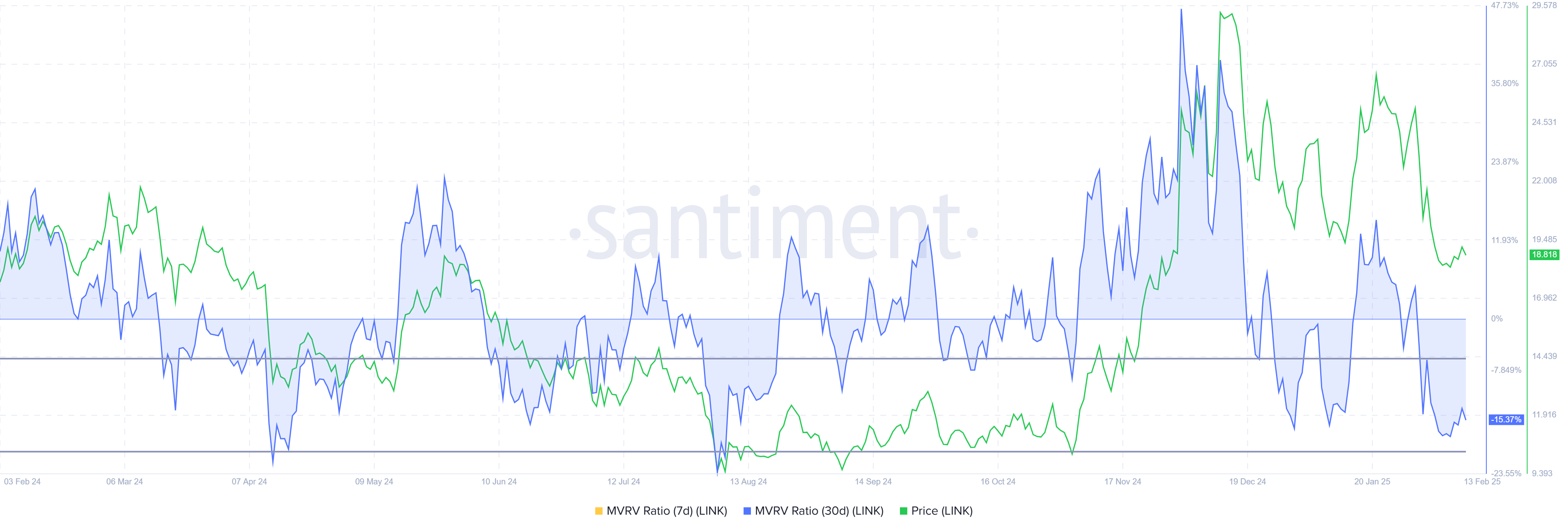 Загальний імпульс Chainlink також під тиском, що відображається у співвідношенні ринкової вартості до реалізованої вартості (MVRV), яке наразі становить -15%. Це означає, що ті, хто купив LINK за останній місяць, зазнають збитків у середньому на 15%. Співвідношення MVRV зараз знаходиться у зоні можливостей, між -8% та -19%, що сигналізує про потенціал для розвороту.