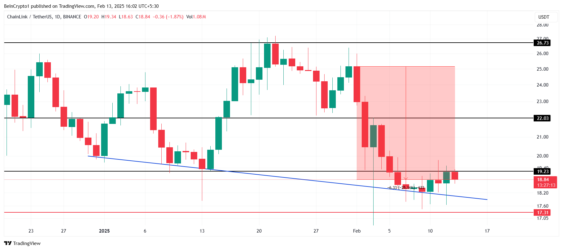 Ціна Chainlink знизилася на 25% з початку місяця, наразі торгується на рівні 18,84 доларів. Альткоїн зазнає труднощів з проривом опору на рівні 19,23 доларів протягом останнього тижня, що вказує на критичний рівень, який має бути подоланий для потенційного відновлення.