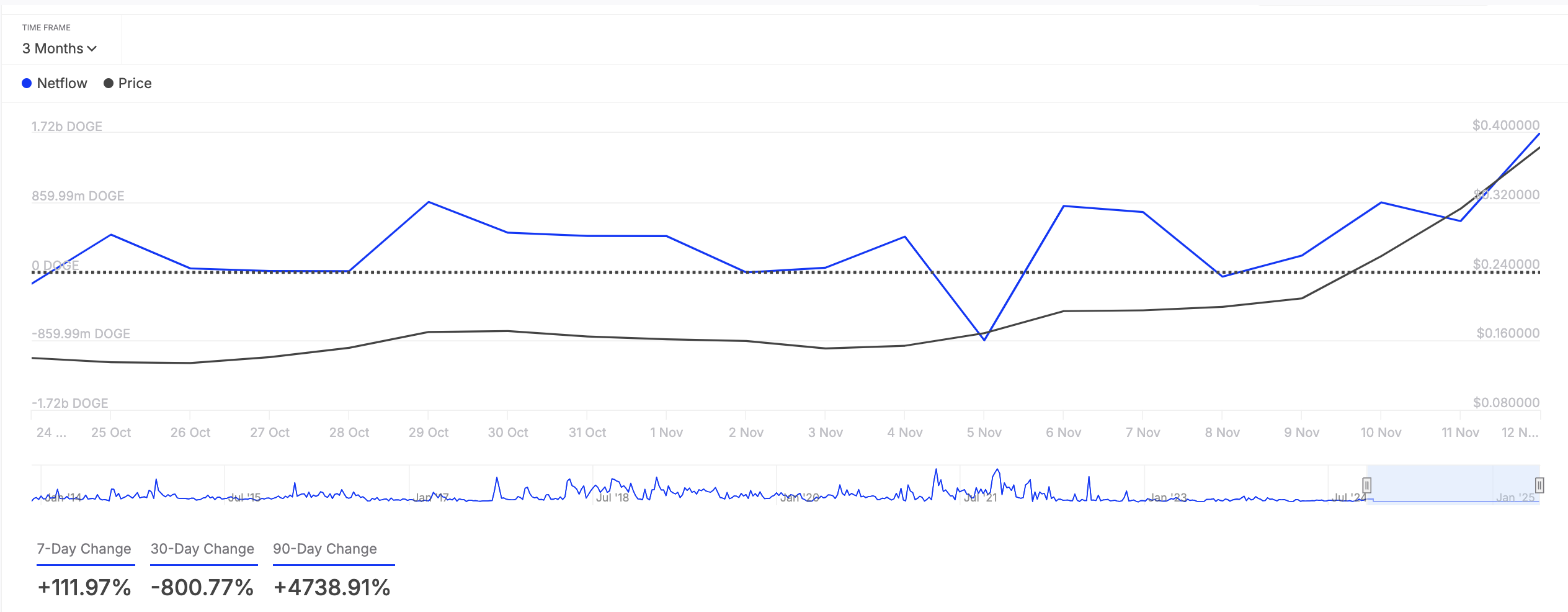 Крім зменшення активності продажу, кити DOGE збільшили свої запаси за останній тиждень. Це відображено у зростанні на 112% чистого потоку великих власників за цей період.