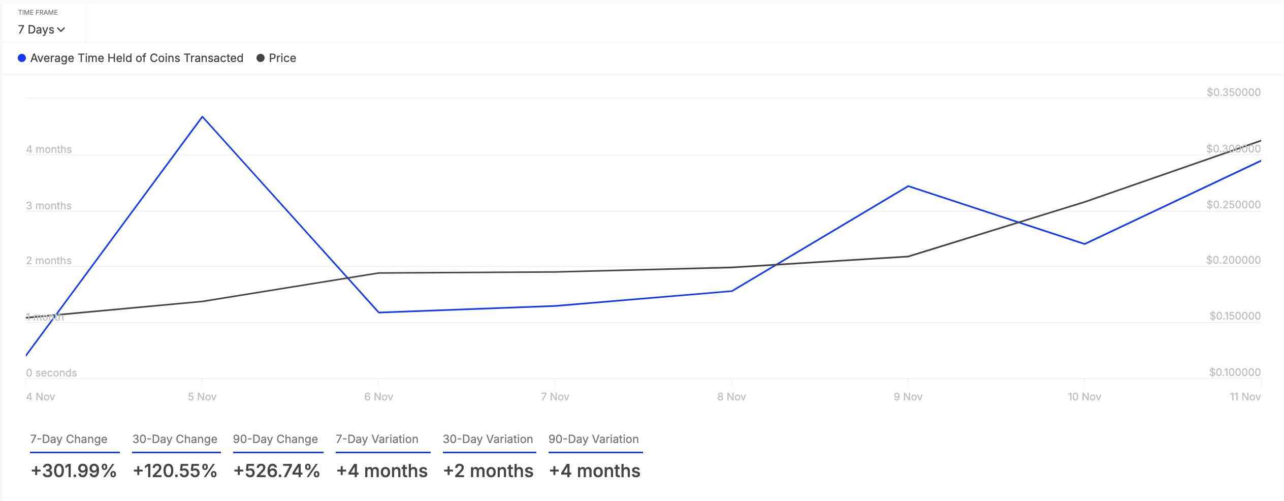 SponsoredЧас утримання транзакційованих монет активу представляє середню тривалість, протягом якої токени зберігаються в гаманцях перед продажем або передачею.