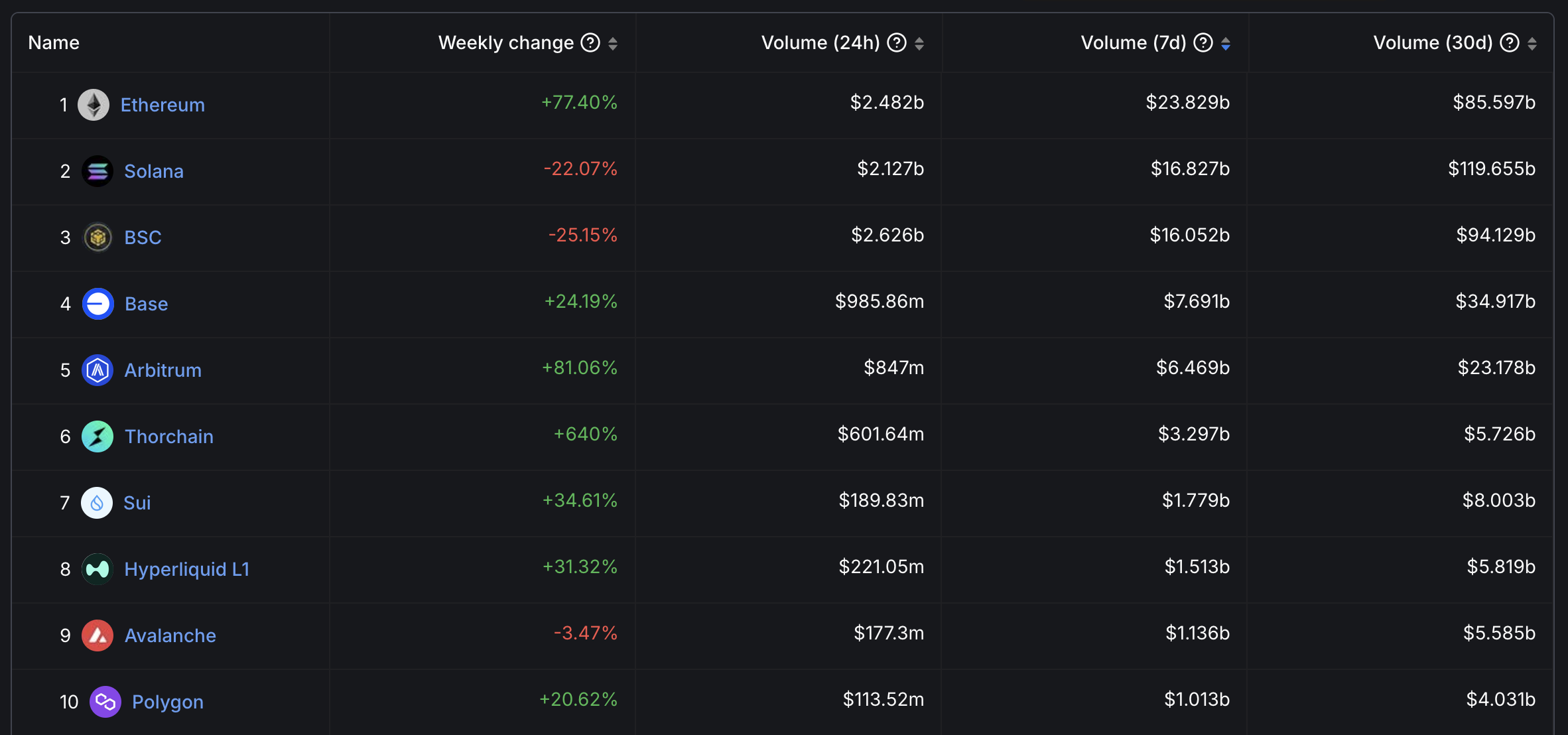 Серед найбільших ланцюгів Solana наразі займає друге місце за обсягом за останні сім днів, поступаючись лише Ethereum, але її тісно переслідує BNB, який останнім часом набирає обертів.