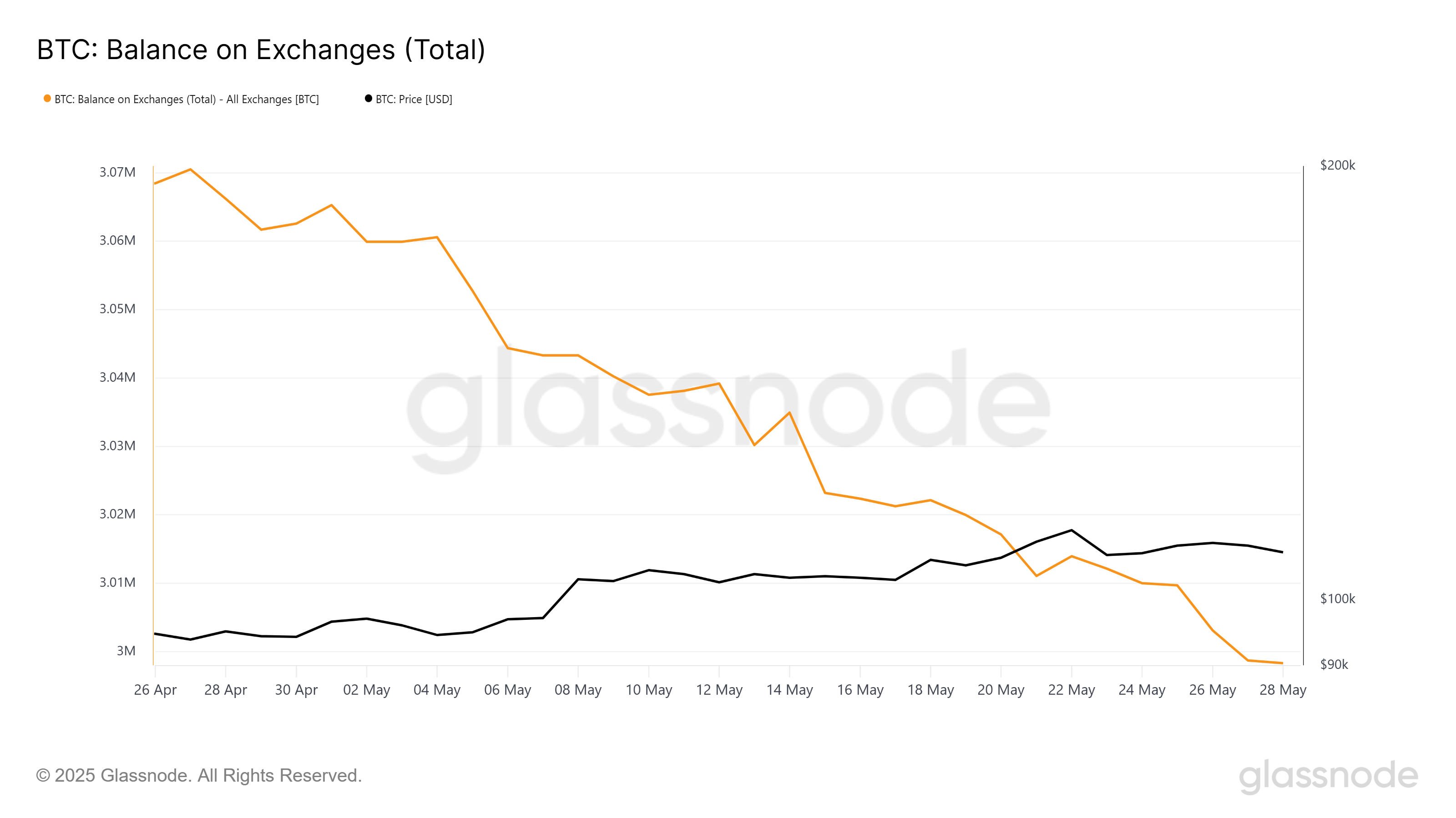 Настрій на ринку біткоїна наразі визначається сильною акумуляцією. Баланс на біржах знизився на 66 975 біткоїнів, вартістю понад 7,2 млрд доларів, що свідчить про те, що інвестори переміщують свої активи з бірж у приватні гаманці. Це суттєве зниження доступного біткоїна на біржах свідчить про зростаючу довіру до активу та віру в подальше зростання цін.