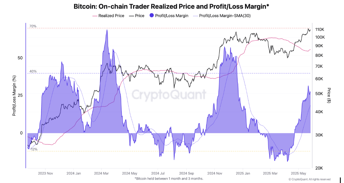 Дані з блокчейну вказують на ключові індикатори, які свідчать про те, що макроекономічний імпульс біткоїна залишається сильним. Реалізована ціна та маржа прибутку/збитку трейдерів на блокчейні зростають, що свідчить про те, що інвестори в біткоїн, особливо ті, хто купив 1-3 місяці тому, мають значні нереалізовані прибутки. Ці дані допомагають оцінити поведінку інвесторів і вказують на те, що багато хто з них все ще утримує активи, очікуючи подальшого зростання цін.