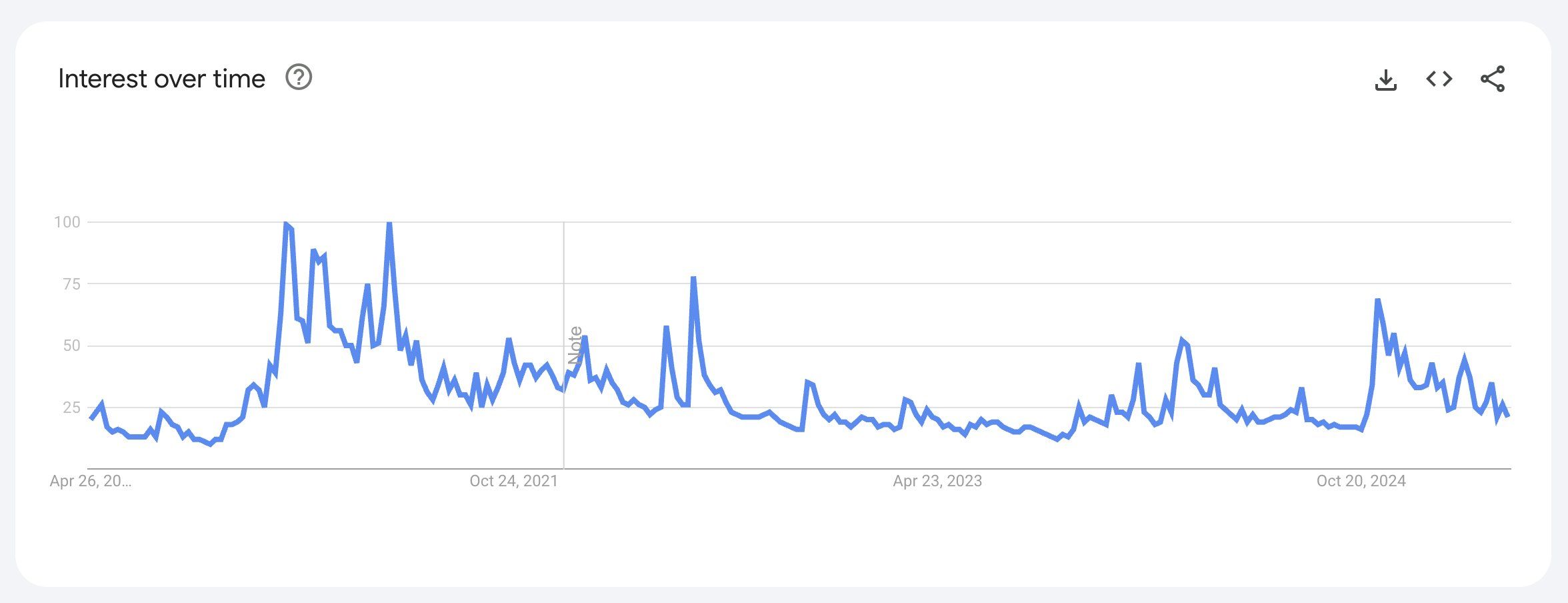 Графік Google Trends показує, що суспільний інтерес поступово знижувався після сплесків обсягу пошукових запитів у 2017 та 2021 роках, які збігалися з основними бичачими ралі біткоїна. Зараз він коливається на низькому рівні протягом кількох років.
