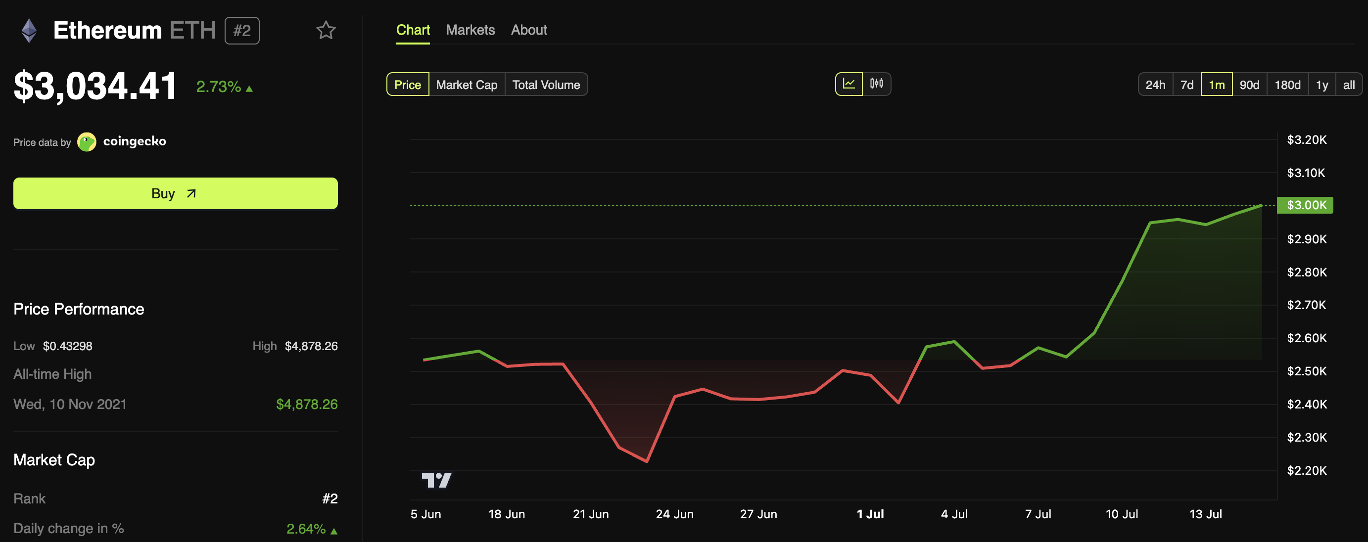 Дані BeInCrypto показали, що друга за величиною криптовалюта за останню добу зросла на 2,73 %. На момент написання, торгова ціна ETH становила 3 034 доларів.