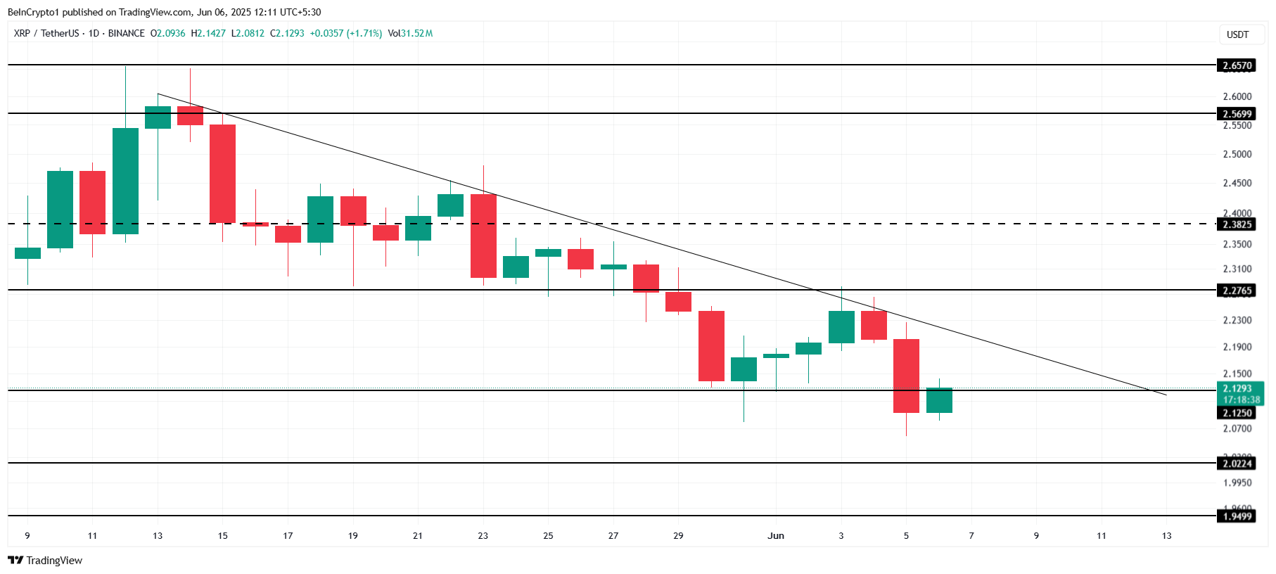 Тривале падіння з середини травня триває, оскільки XRP не вдалося подолати низхідний тренд цього тижня. Однак, якщо накопичення китів буде достатньо сильним, щоб переважити продаж LTH, XRP має потенціал відскочити від підтримки у 2,12 доларів і зрештою подолати опір у 2,27 доларів. Це анулювало б поточний низхідний тренд і вказувало б на потенційний висхідний рух для альткоїна.