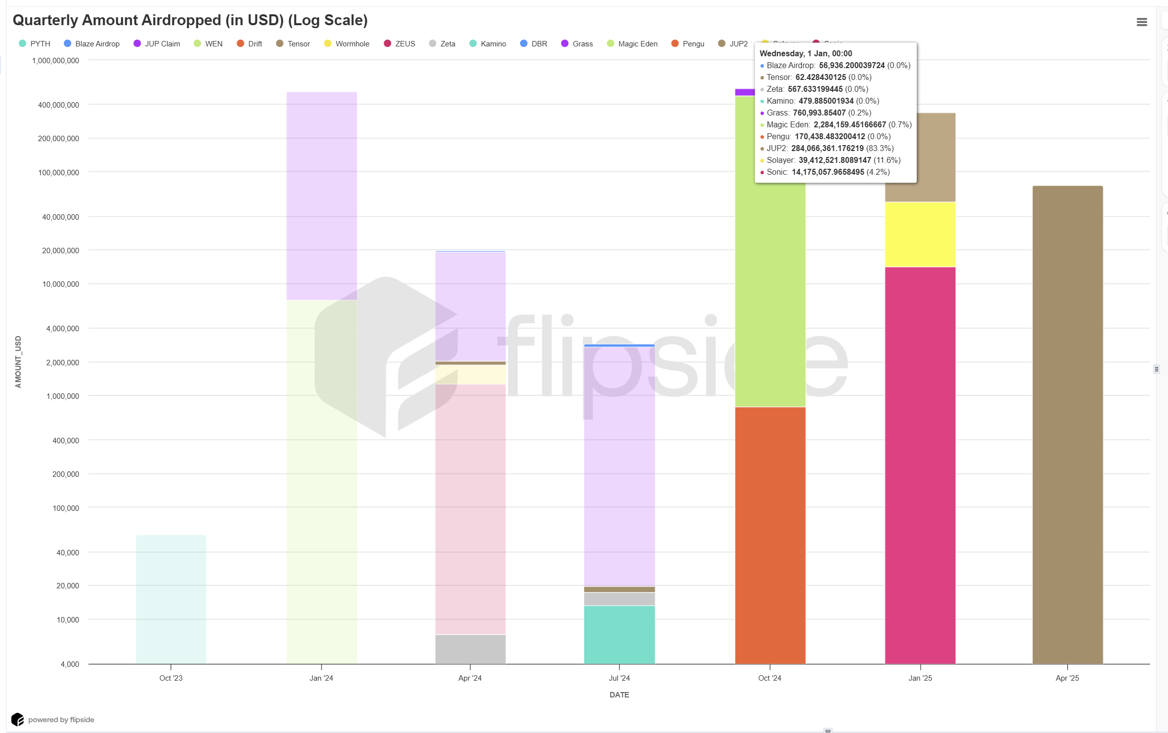 Користувач X data_bros поділився переконливими даними: 558 млн доларів було розподілено через ейрдропи на Solana у четвертому кварталі 2024 року, а потім 341 млн доларів у першому кварталі 2025 року. Ці цифри підкреслюють, що ейрдропи залишаються важливою стратегією для проєктів з розподілу токенів та залучення користувачів, навіть якщо вони не досягли свого колишнього «золотого» піку.