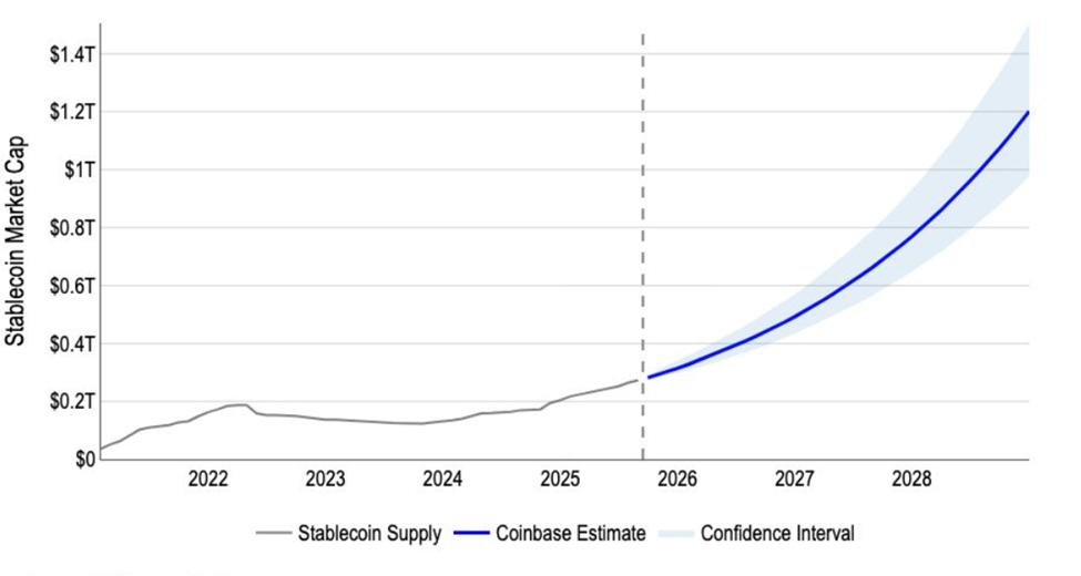 Нові прогнози Coinbase свідчать про те, що сектор стейблкоїнів може зрости до 1,2 трильйона доларів до 2028 року.