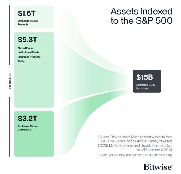 Дані Bitwise підкреслюють, що 5,3 трлн доларів від інституційних інвесторів та 1,6 трлн доларів від ETF-ів сприятимуть 15 млрд доларів у прогнозованих покупках Coinbase. Це відображає зростаюче визнання криптокомпаній у традиційних фінансах (TradFi).