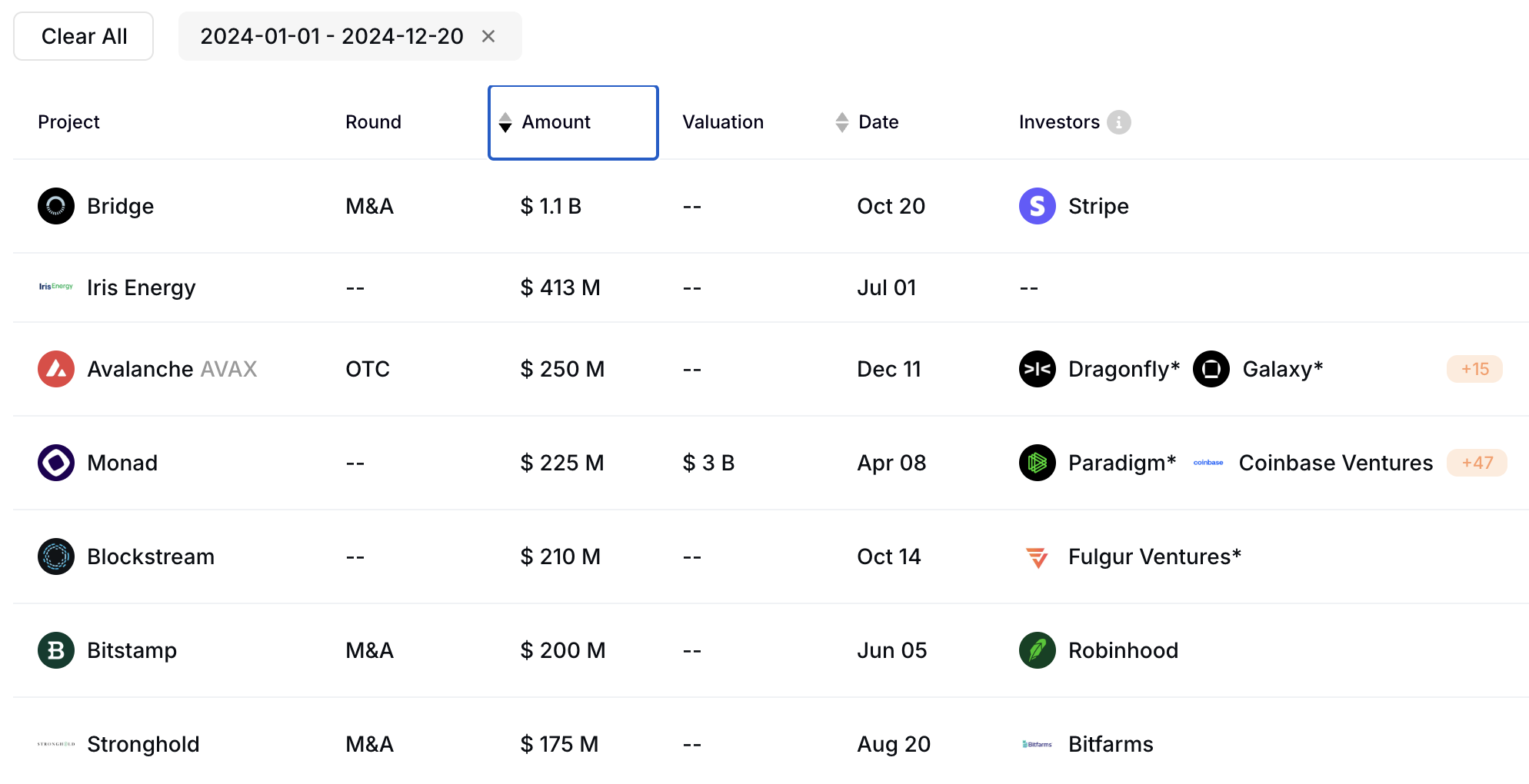 Найбільша одиночна інвестиція відбулася в жовтні завдяки Stripe, великій платіжній платформі. У “знаковій” угоді, призначеній для полегшення діяльності компанії в криптопросторі, Stripe придбала Bridge за 1,1 мільярда USD. Ця величезна сума легко очолила список найбільших залучень коштів, більш ніж удвічі перевищивши найближчого конкурента.