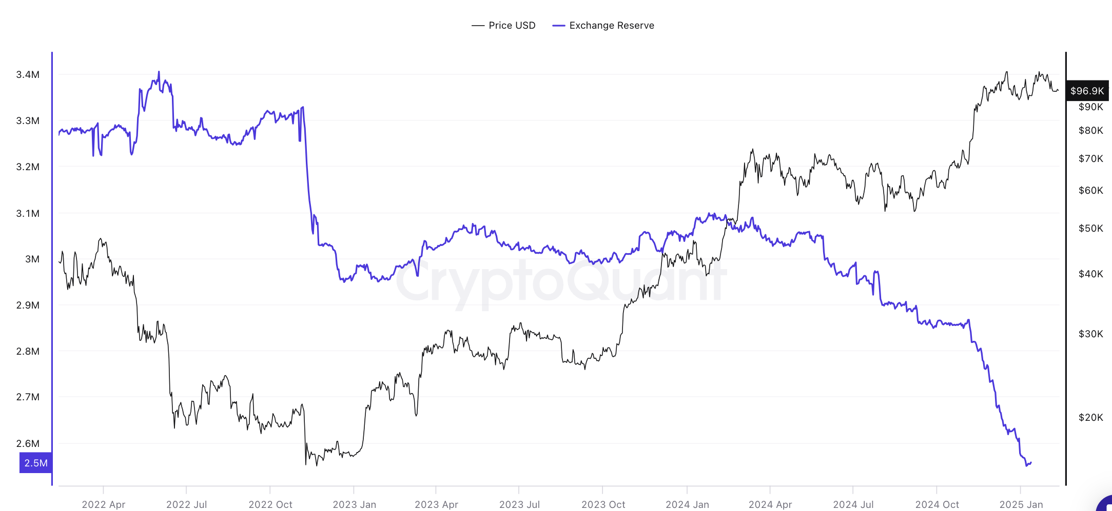 Біткоїн може зіткнутися з великим шоком пропозиції, оскільки резерви на біржах досягли найнижчого рівня за останні роки. Дані CryptoQuant показують, що резерви на найнижчому рівні з моменту початку запису цих даних у 2022 році.