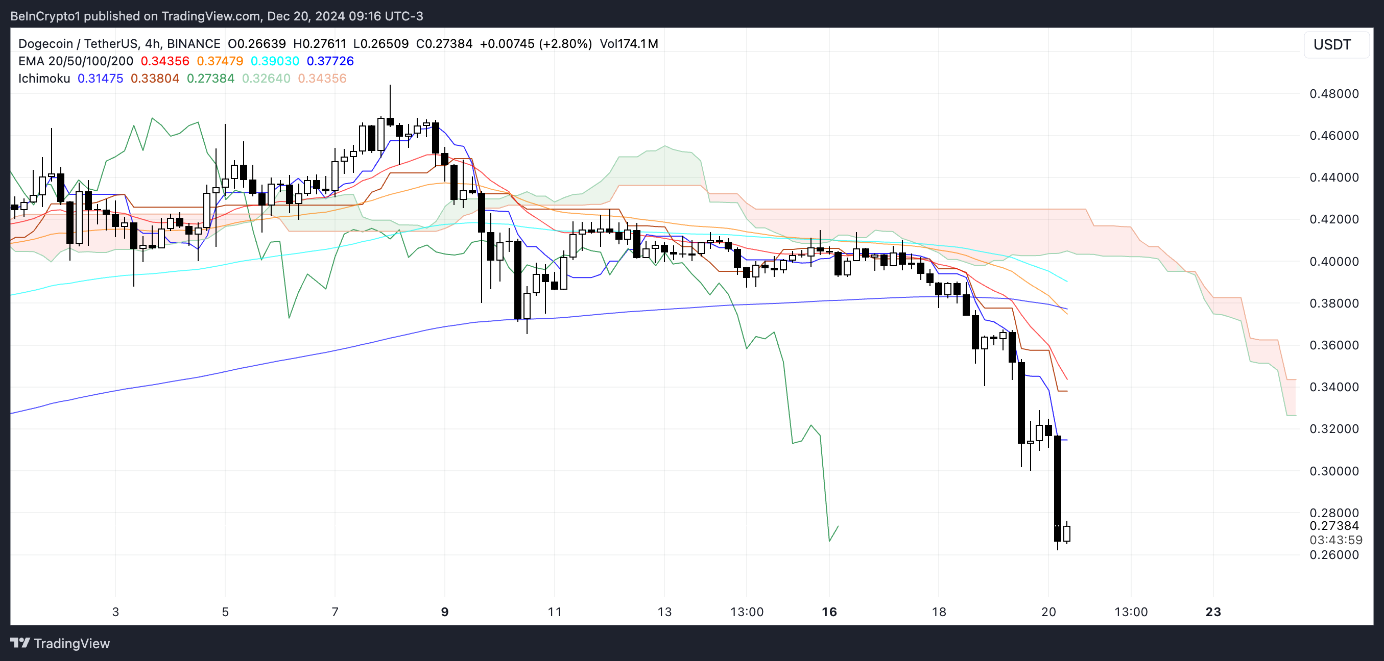 Якщо спадний моментум продовжиться, ціна DOGE може зазнати подальших падінь, з рівнями підтримки, ймовірно, біля недавніх мінімумів. Розворот вимагатиме, щоб ціна прорвалася вище хмари і щоб синя лінія Tenkan-sen перетнула червону лінію Kijun-sen, жодне з яких не здається неминучим на даний момент.