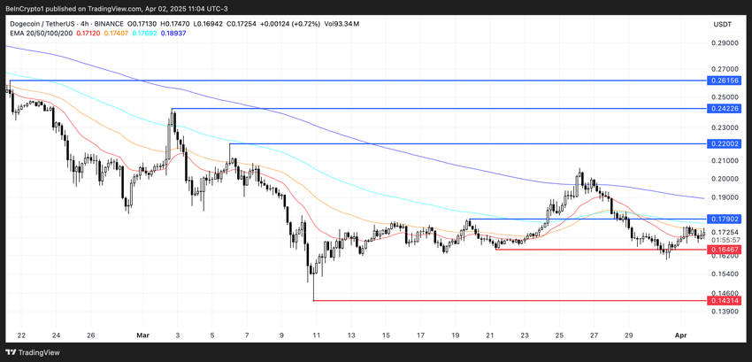 Однак, якщо цей тренд зміниться і коротші EMA перетнуть довші, ціна Dogecoin може кинути виклик негайному опору на рівні 0,179 доларів, потенційно відкриваючи шляхи до вищих цілей, якщо цей рівень буде подолано.